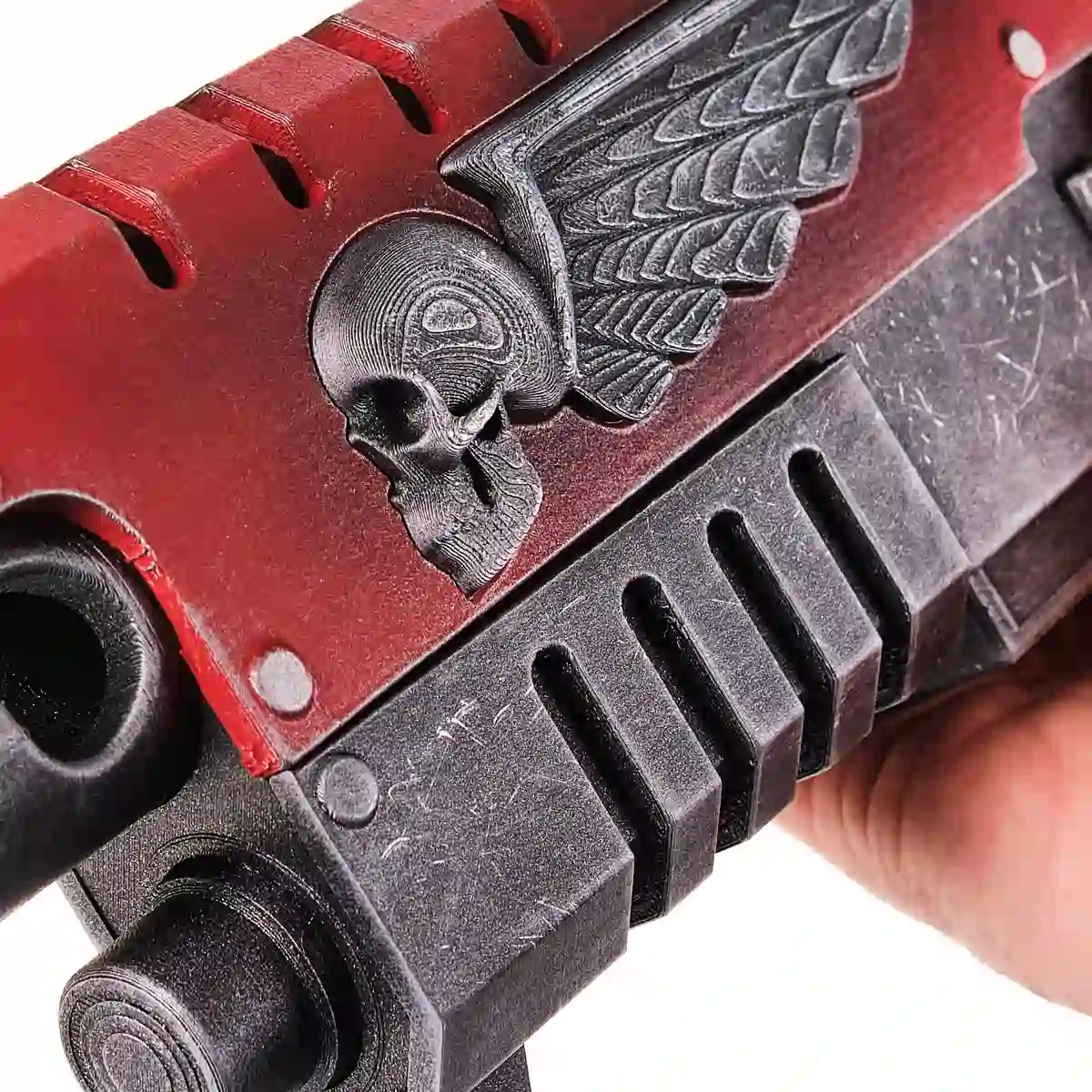 This prop replica features a large, blocky frame with strong lines and layered armor plating. The red upper casing contrasts with the dark body, giving it a striking and battle-worn look. Detailed engravings, including a winged emblem and skull accents, add character and depth. The grip is shaped for a solid hold, and the chunky front end gives it a powerful silhouette.