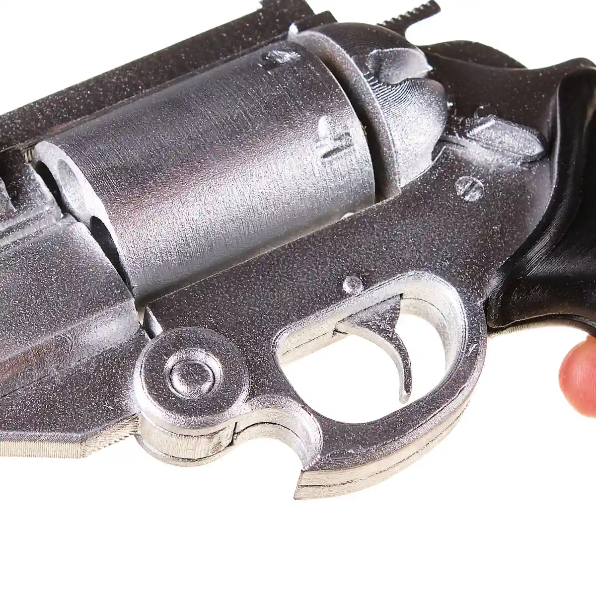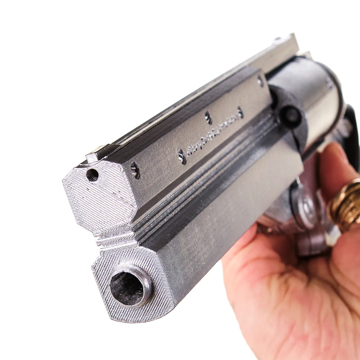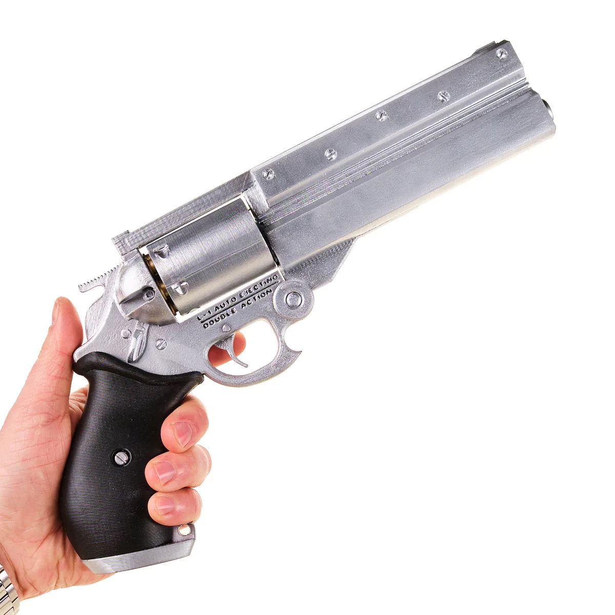 The silver body finish contrasts with the black ergonomic grip, while the detailed chamber and mechanical elements give the prop its distinctive sci-fi revolver appearance.