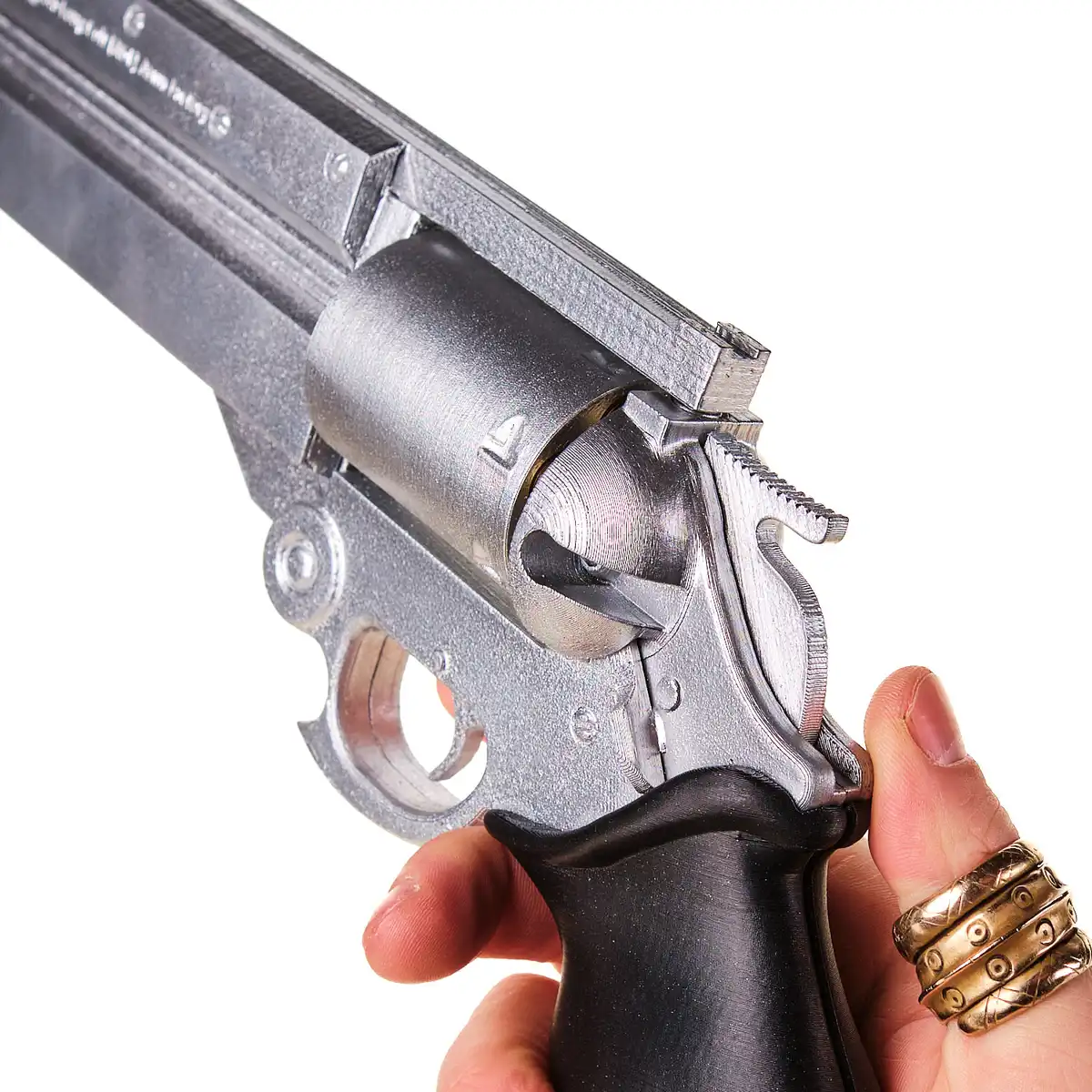 Made from plastic. This prop replica includes an openable chamber, removable bullets, and a rotating cylinder that clicks when turned, recreating the feel and look of the revolver’s chamber mechanism.