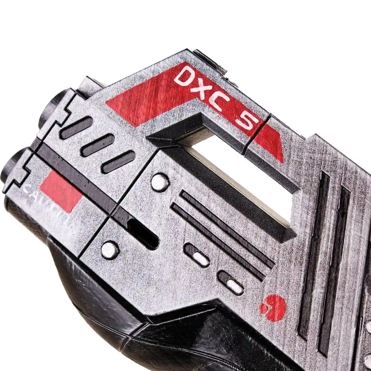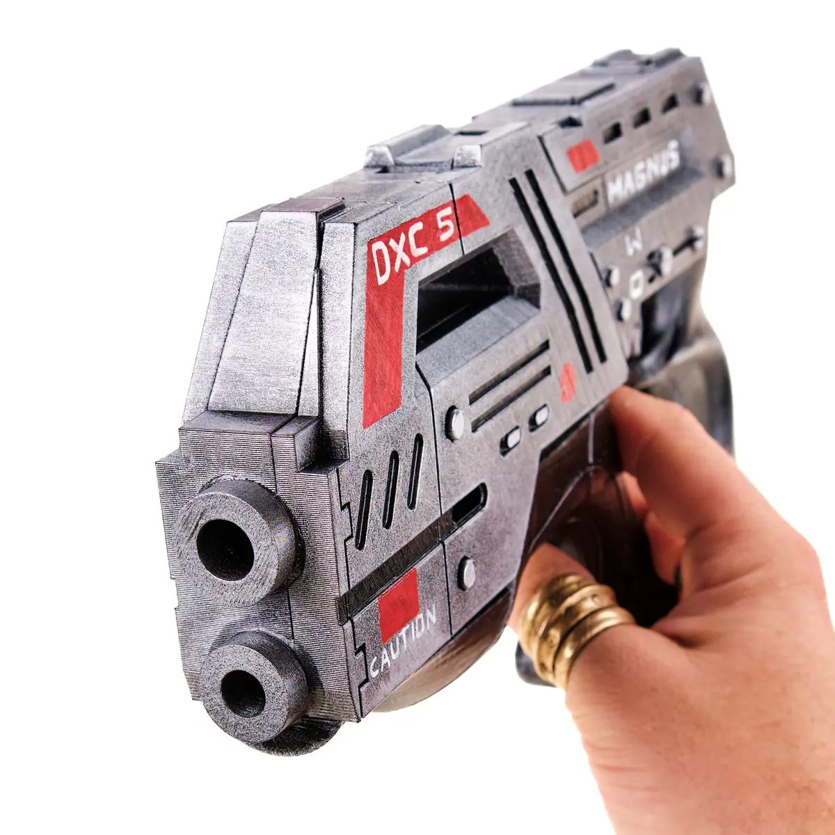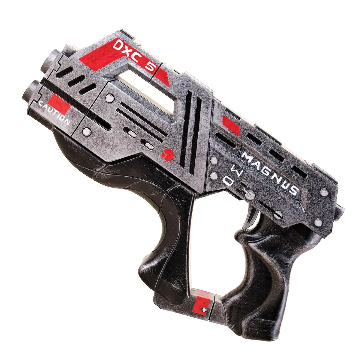 This prop features a compact sci-fi body with bold shapes, high-tech detailing, and accurate in-game markings like “MAGNUS,” “DXC-5,” and red warning stripes. The layered barrel, angular frame, and double-grip cutout give it that signature ME look straight from the battlefield.