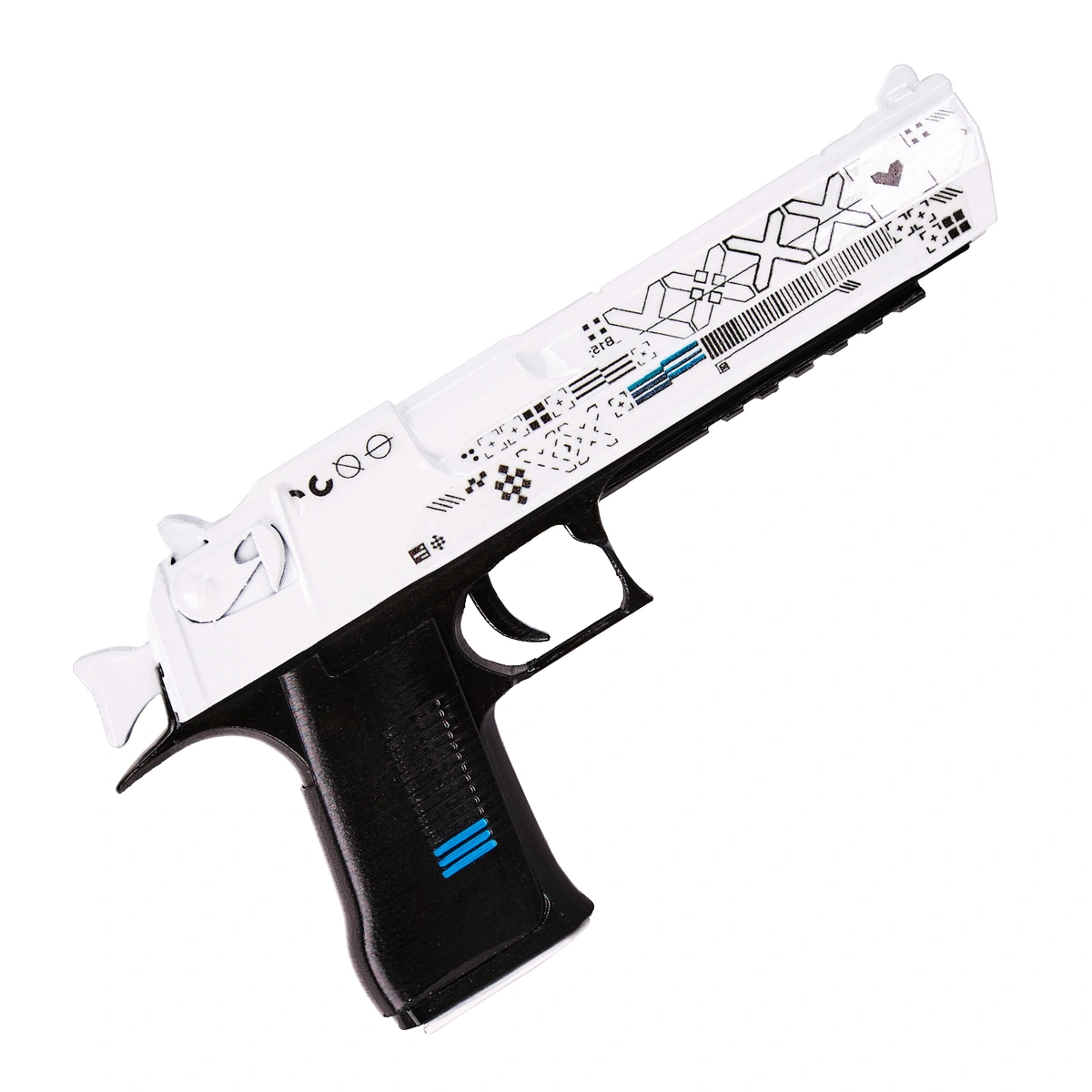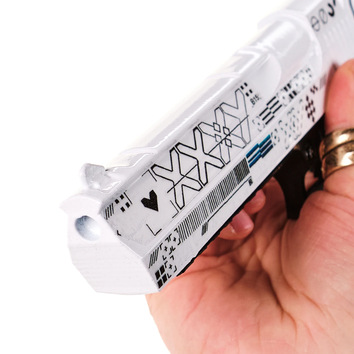 This Desert Eagle prop replica recreates the bold silhouette of the famous sidearm, paired with the clean, futuristic styling of the Printstream skin. The white slide is decorated with detailed geometric markings, subtle symbols, and modern graphic elements that match the look of the in-game weapon.