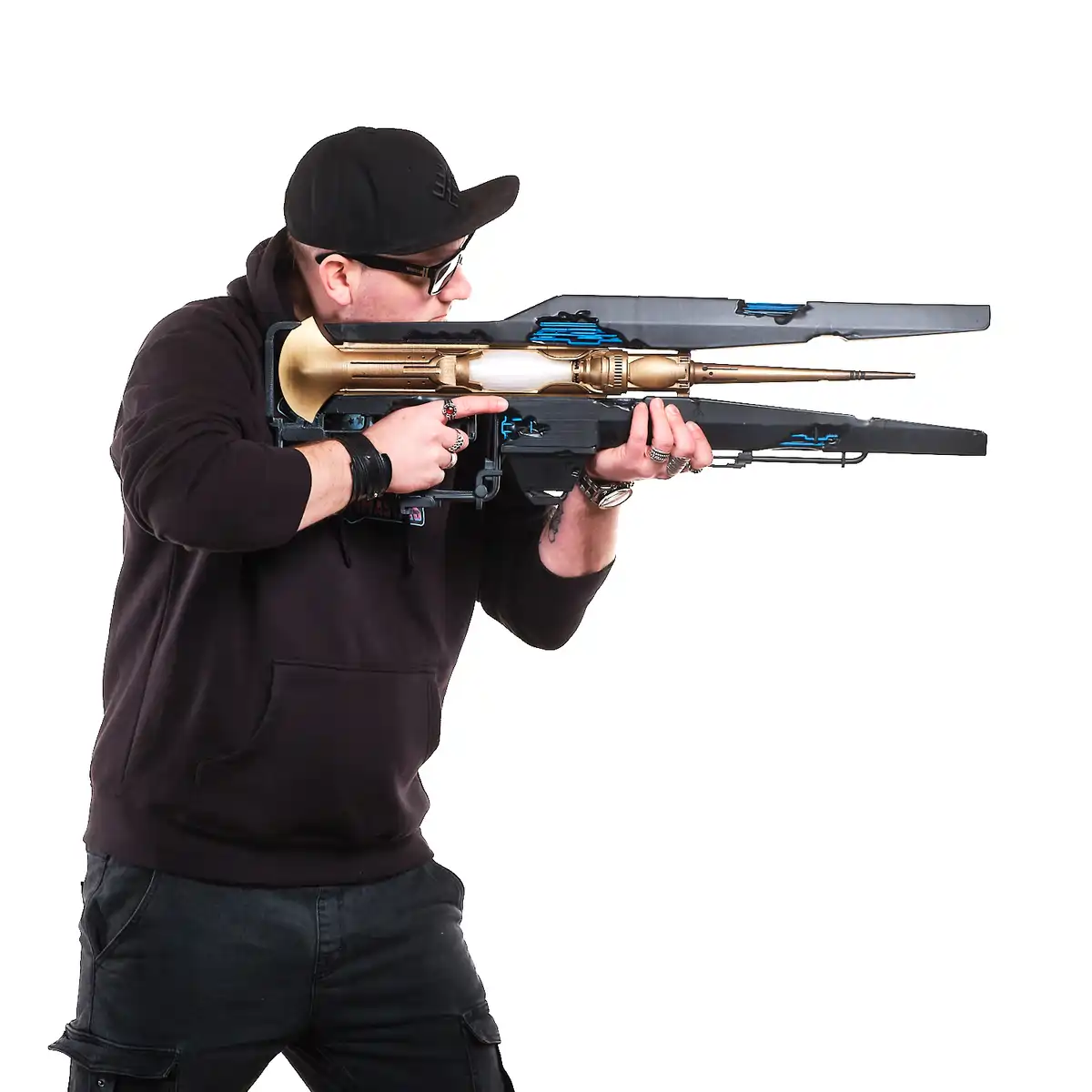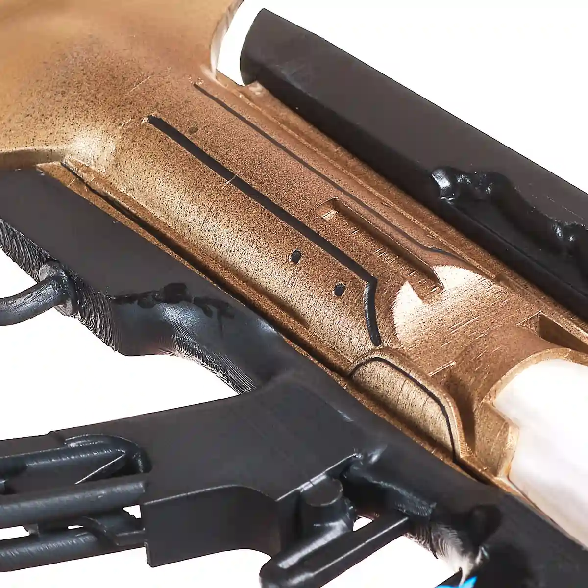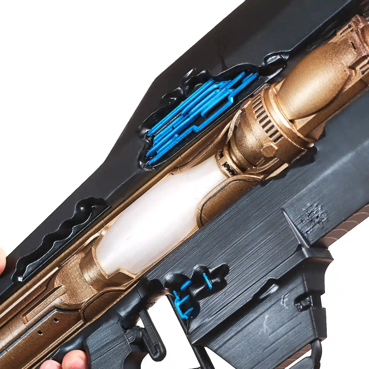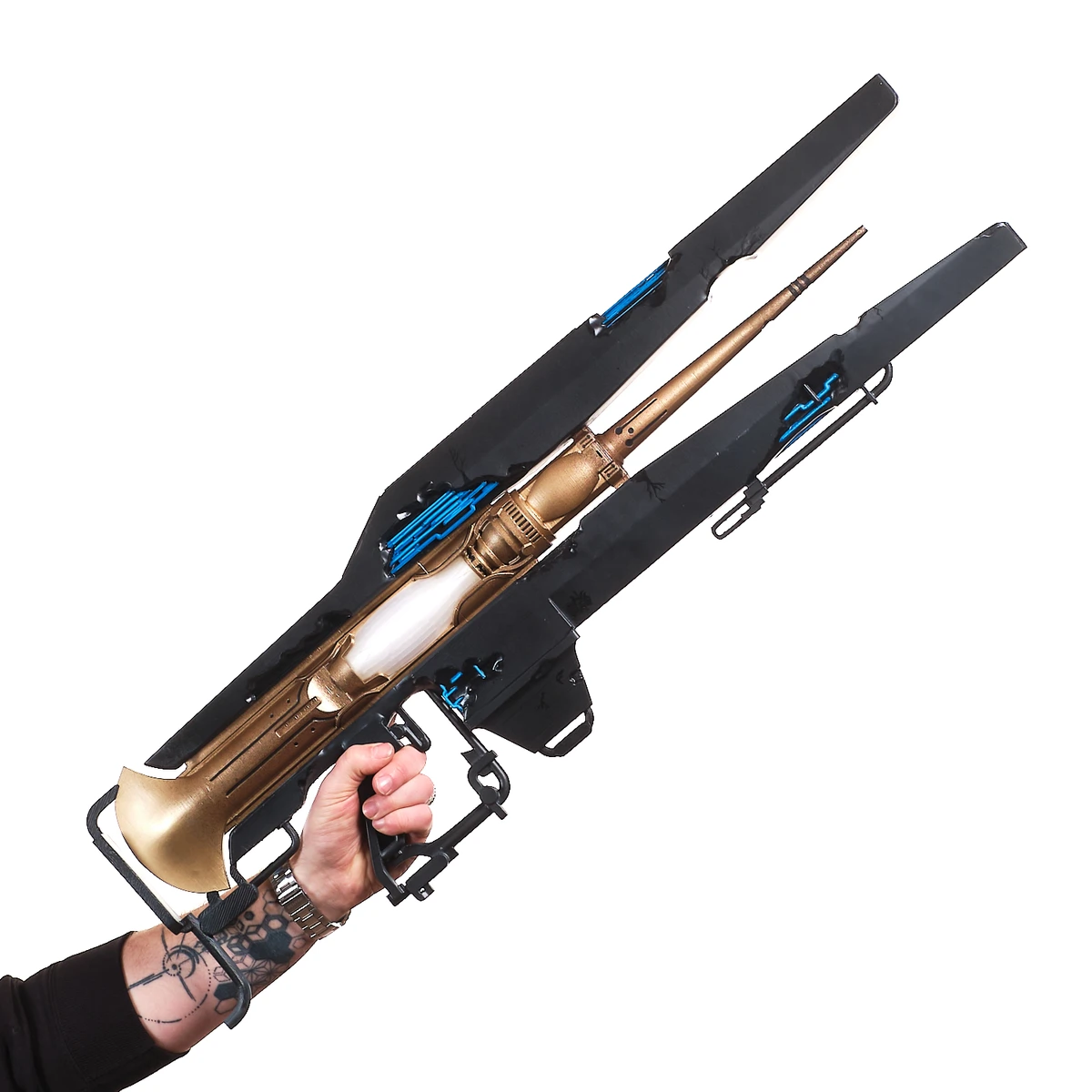 This handcrafted prop replica captures the long, sleek frame, the split black outer panels, and the glowing blue energy details that define its futuristic look. The gold central body and white core section give it that distinct sci-fi contrast, just like the in-game weapon. From the extended barrel to the open, wing-like side structures, every angle reflects its advanced, otherworldly design.