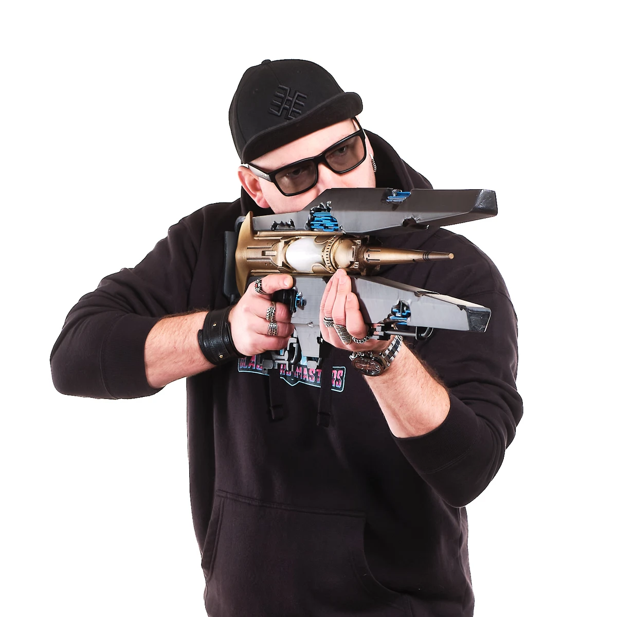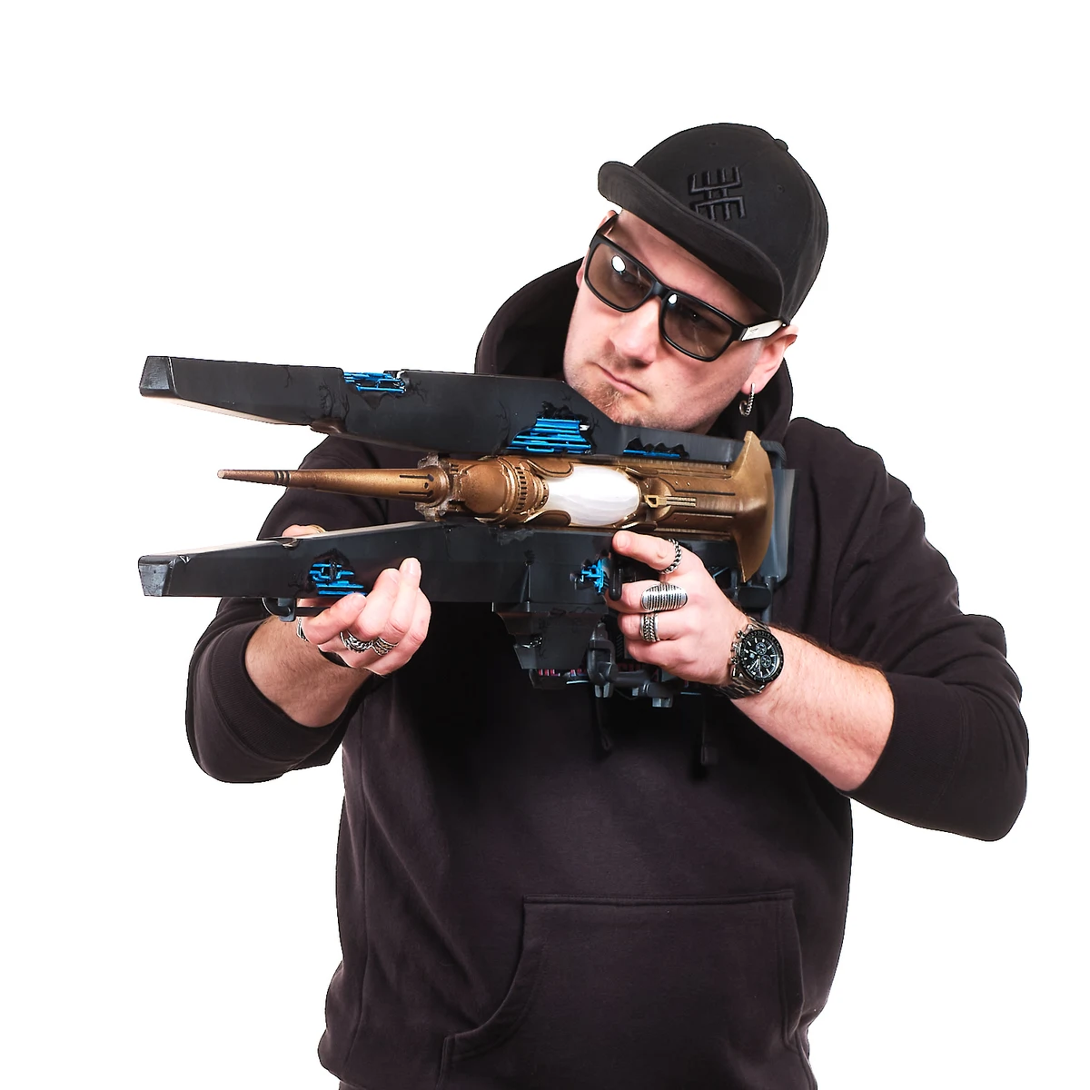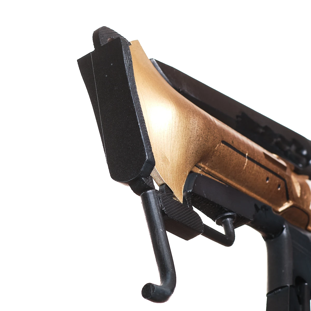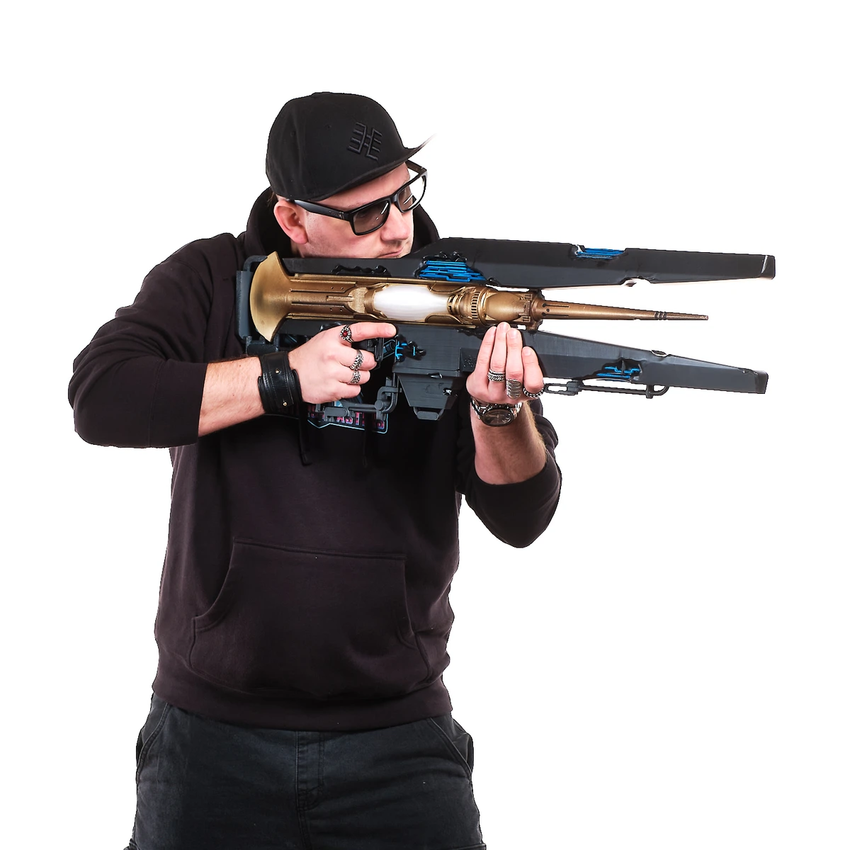 This handcrafted prop replica captures the long, sleek frame, the split black outer panels, and the glowing blue energy details that define its futuristic look. The gold central body and white core section give it that distinct sci-fi contrast, just like the in-game weapon. From the extended barrel to the open, wing-like side structures, every angle reflects its advanced, otherworldly design.