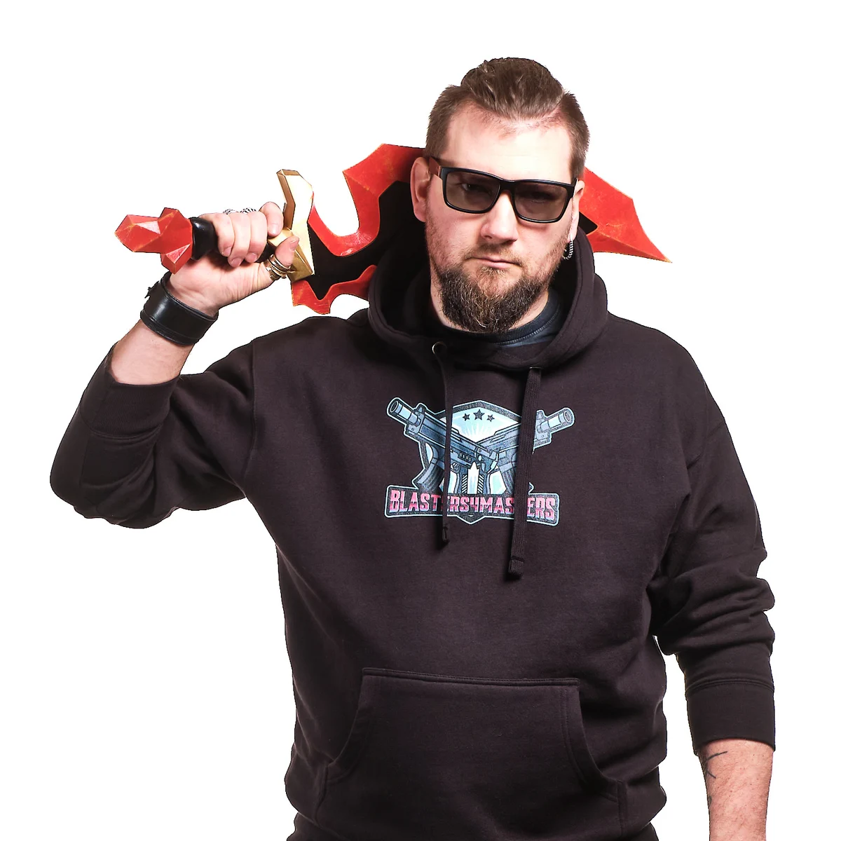 This handcrafted prop replica captures the wide, curved blade with its deep red finish and black inner detailing. The sharp geometric edges and chipped paint effect give it a battle-worn look, as if it has already seen countless fights. The gold crossguard and faceted pommel add contrast, while the thick black handle gives it a strong, heroic silhouette.