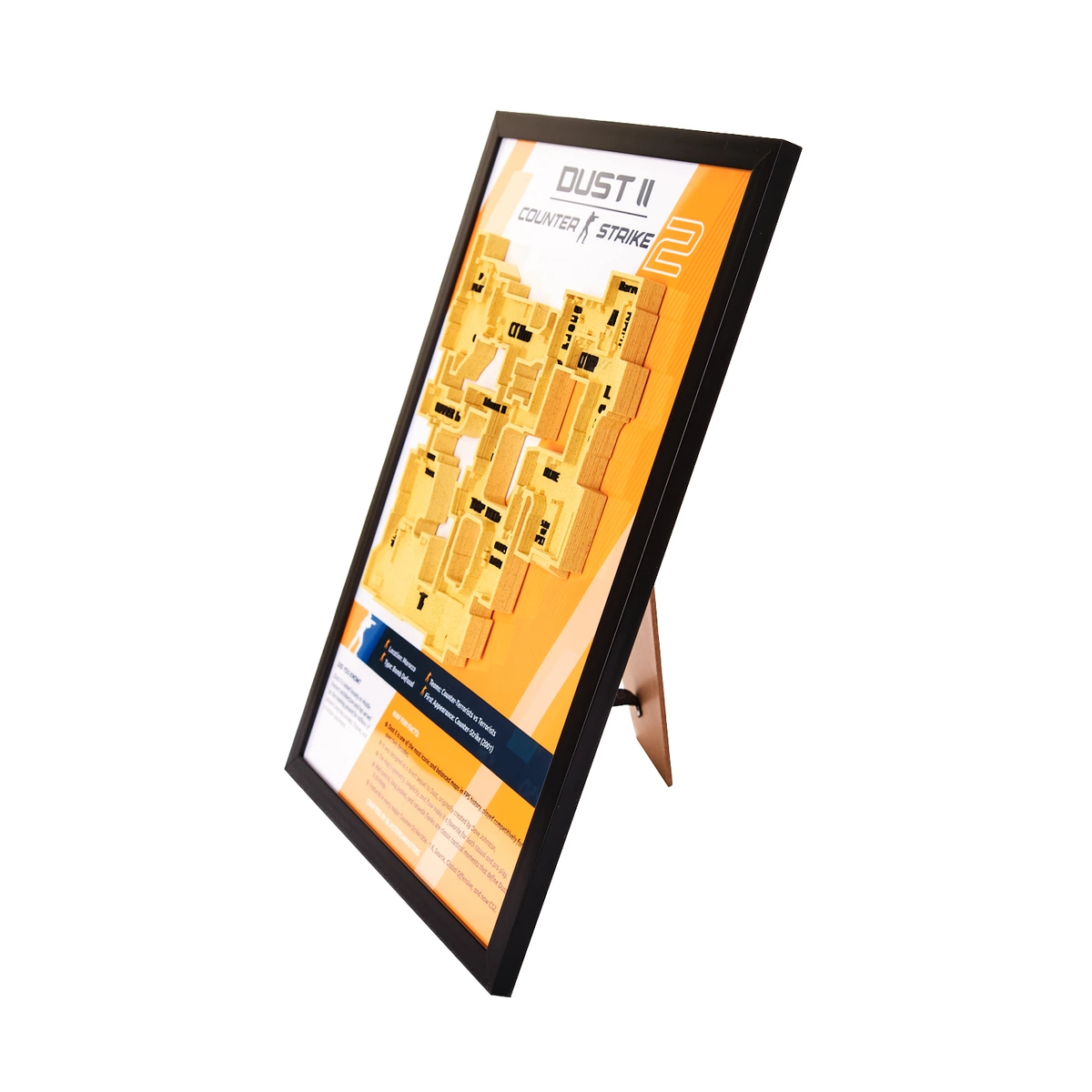 The plaque features a raised 3D layout of Dust 2, with clearly marked zones like A Site, B Site, Mid, and tunnels. The design sits inside a clean frame with a printed background that adds contrast and style. It can stand on a desk using the built-in support or be hung on a wall for display.