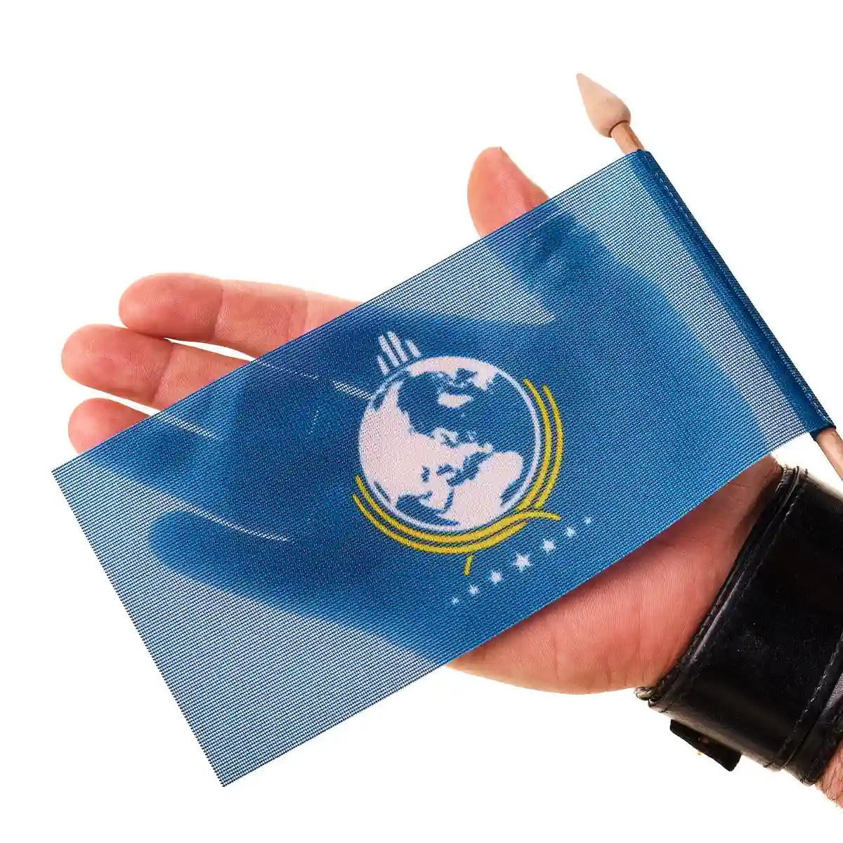 The flag stands on a wooden base with a wooden pole, and the flag itself is made of fabric for a smooth and realistic look. The full height of the display is 33.5 cm (about 13.2 inches).