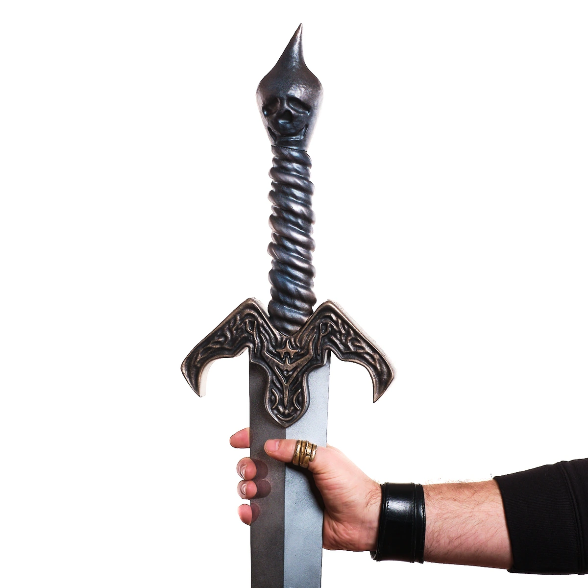 The sword has a smooth, clean blade and an ornate guard that shows off the classic demonic style. It is made of plastic, and the blade is non sharp. This is a static prop, so the blade, guard, and handle do not move.