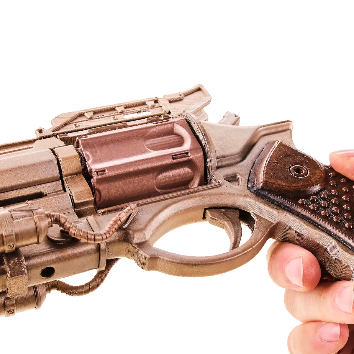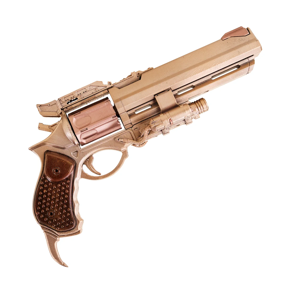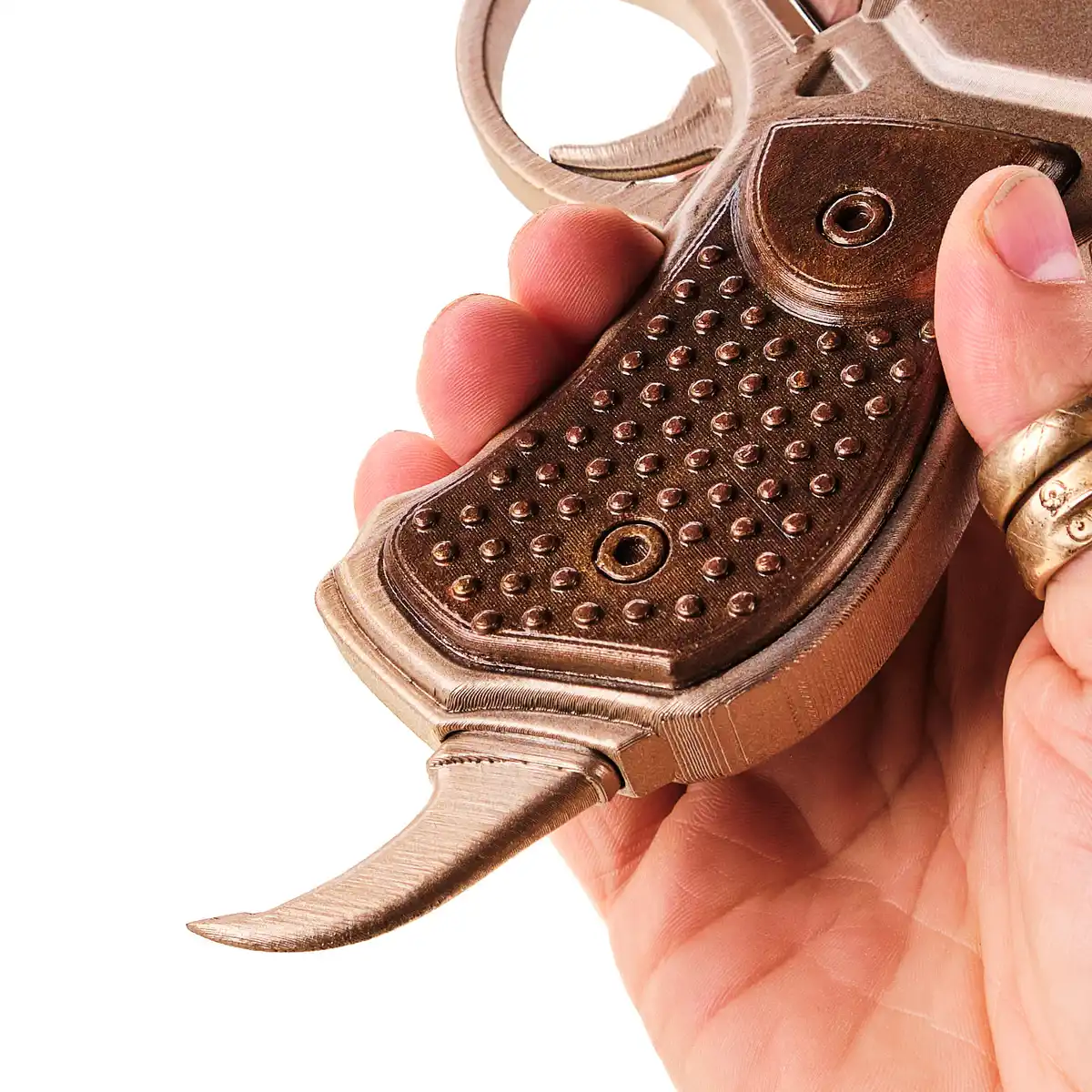 This prop replica features a long, angular barrel with clean lines and a bold silhouette. The copper finish gives it a rich and polished look, while darker accents add depth and contrast. The detailed cylinder and frame design reflect the weapon’s distinct style, and the grip includes textured panels for a classic hand cannon feel. The chamber can be opened, and the bullet is removable, adding an extra level of display detail. Small mechanical elements and layered parts help bring the full design together.