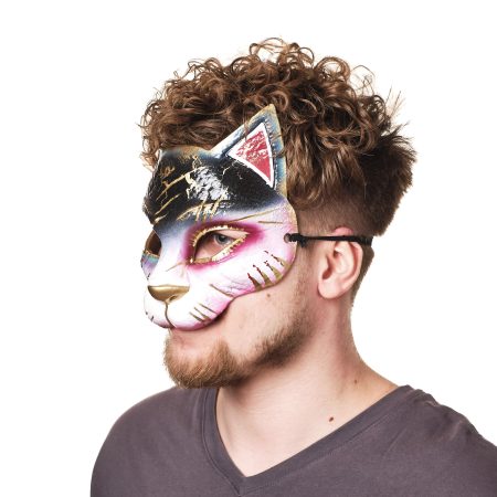 This unique mask features cat-like contours, upright ears, and a beautifully stylized paint job with layered colors, gold streak accents, and a battle-worn texture that hints at hidden stories and silent battles. From the soft pink around the eyes to the turquoise and red ear highlights, this is no ordinary mask—it’s a statement piece for fantasy fans and artistic collectors alike.