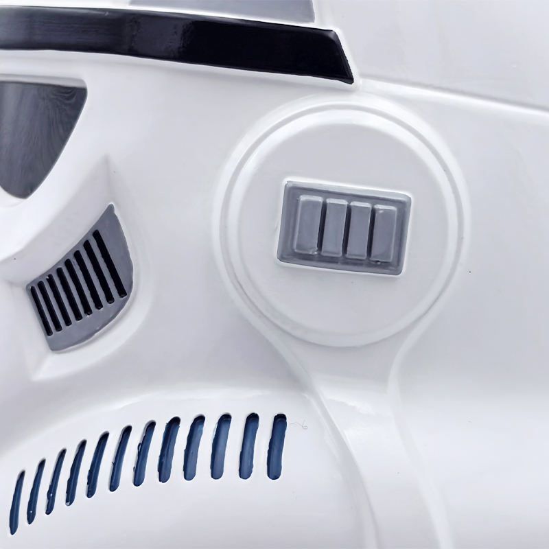 The Classic Trooper Look This helmet nails the original Stormtrooper design from the classic Star Wars trilogy. The smooth white shell, black brow trim, dark eye lenses, side vents, mouth grille, and cheek tubes are all here in clean, sharp detail. No battle damage — just the crisp, factory-fresh look of a trooper ready for duty.