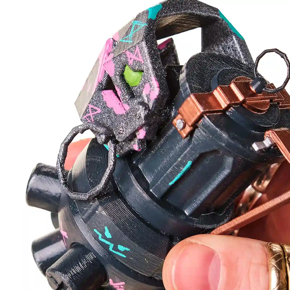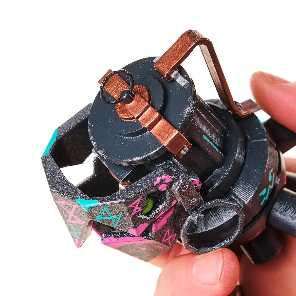 The grenade features a black body with painted details in pink, teal, and copper, complete with sculpted bolts, wires, and a chunky cartoon-style pin. It’s full of attitude and looks just like it does in Arcane.