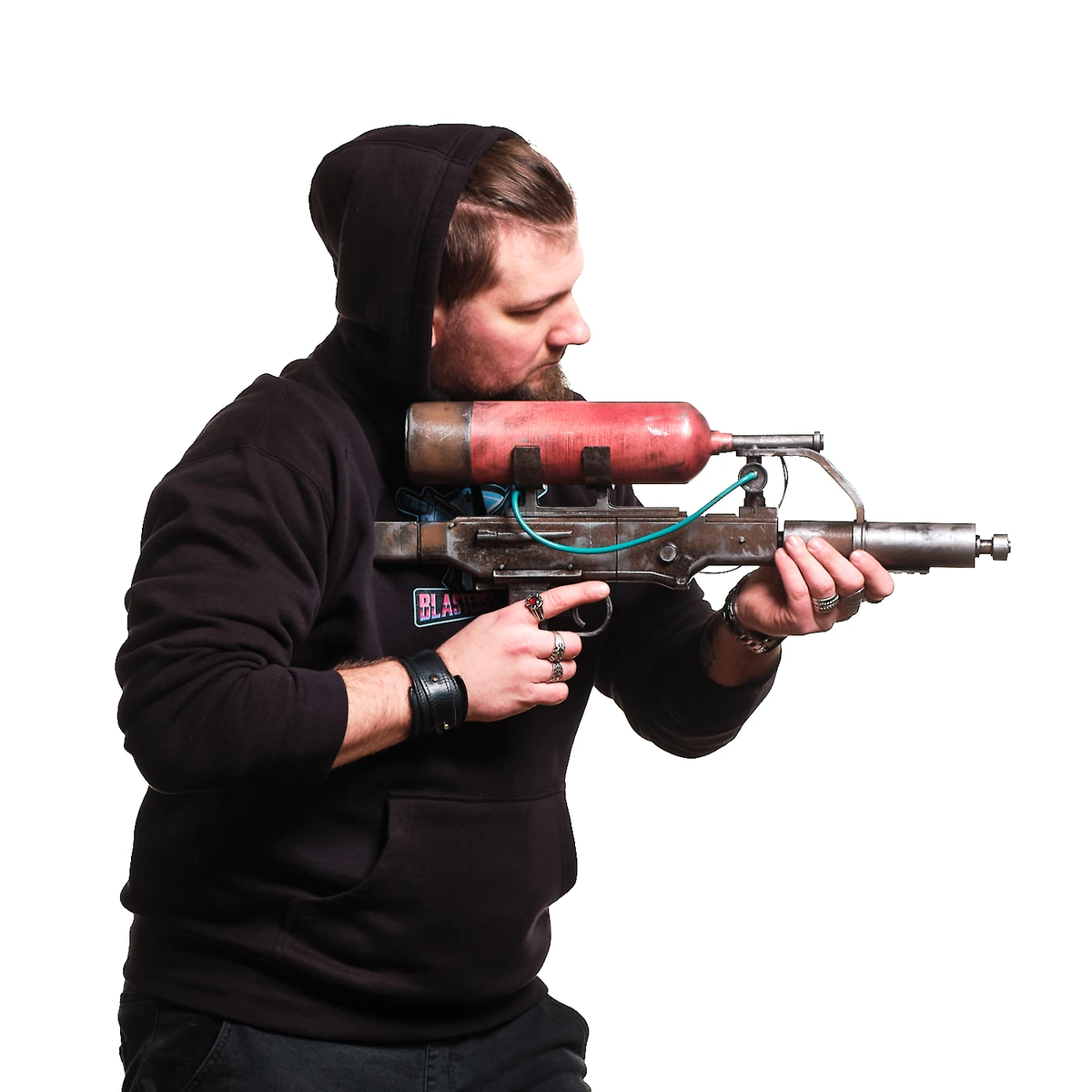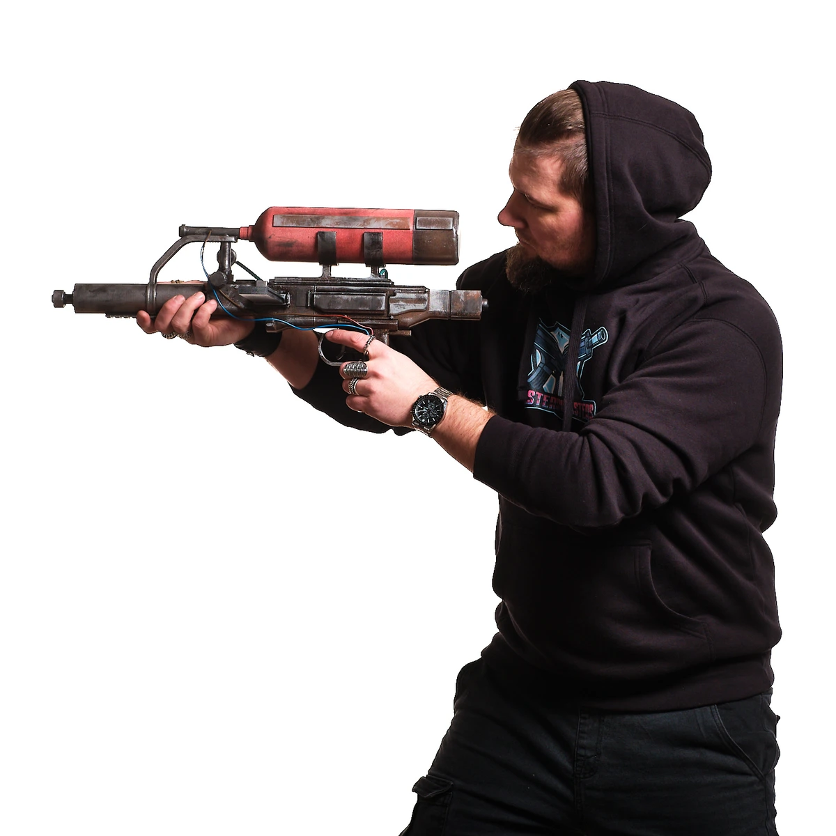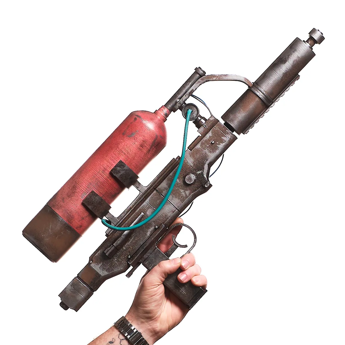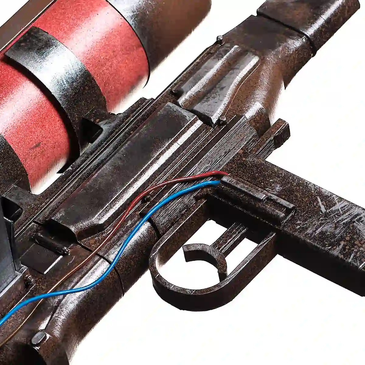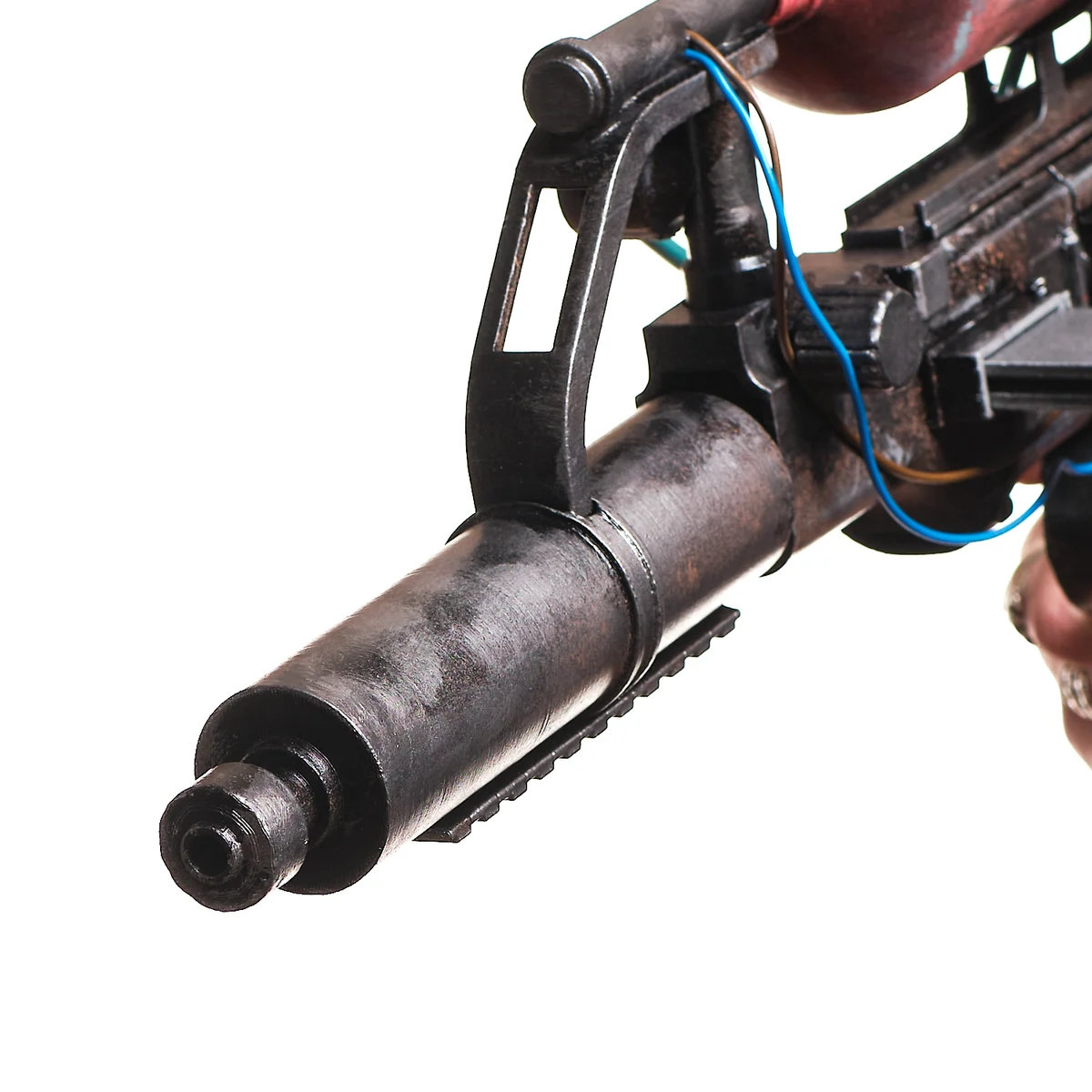 This prop replica features a long, reinforced barrel with a large red tank strapped across the top. Wires in blue, green, and brown wrap around the body, giving it a handmade, field-repaired look—just like something scavenged and built by survivors. It also includes a removable magazine, so you can switch things up when posing or displaying your gear.