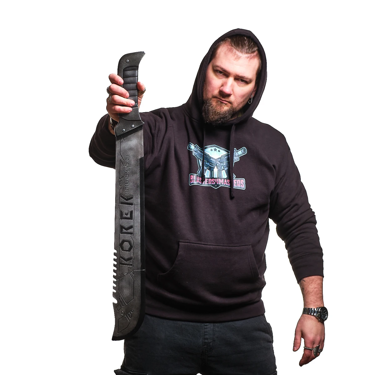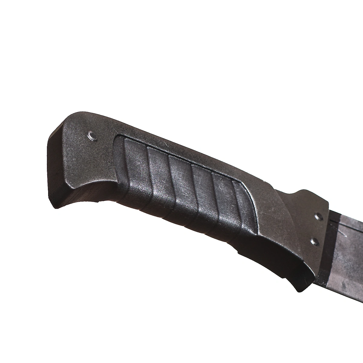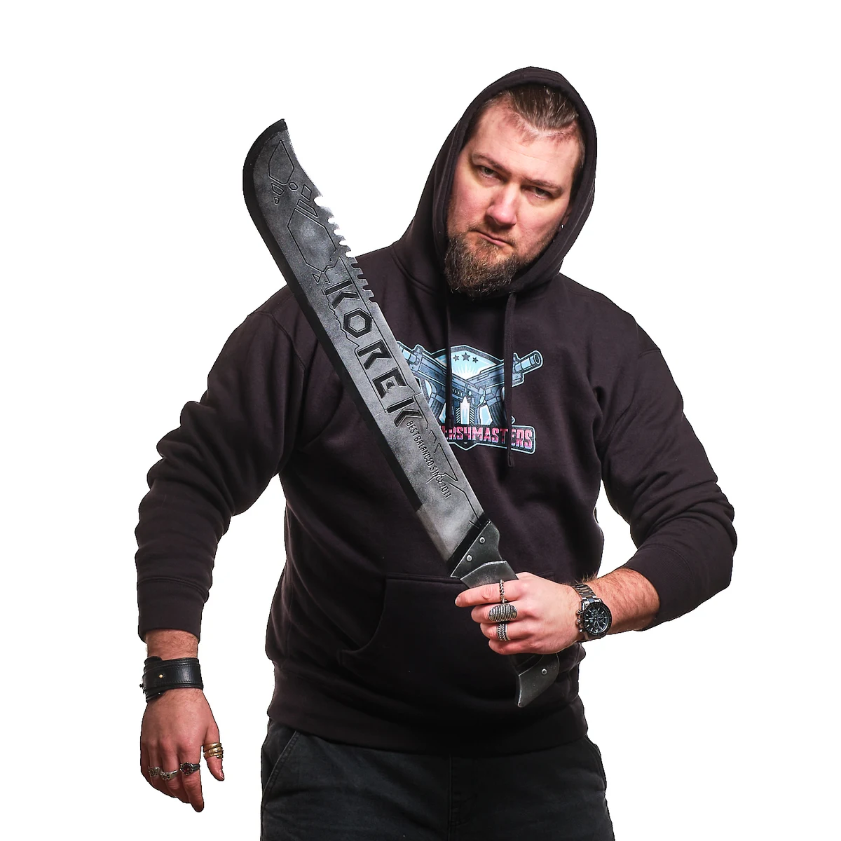This prop replica features the wide, heavy blade with its bold KOREK engraving and jagged spine edge. The weathered metal look gives it that battle-worn survivor style. The thick black handle has molded grip lines for an authentic in-game appearance, making it perfect for cosplay poses or wall display.