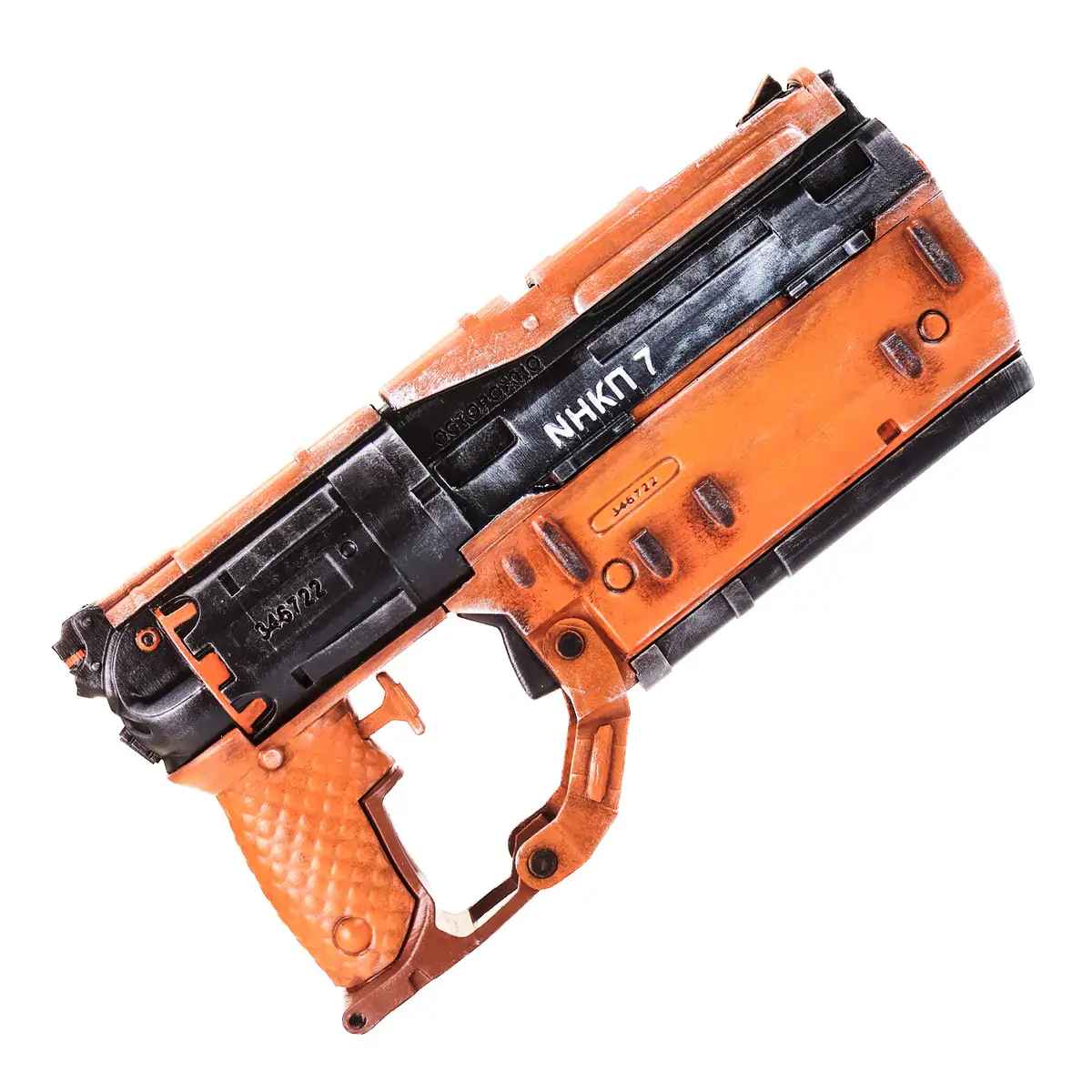 This prop replica features a chunky, sci-fi design with strong lines and layered details. The orange body panels contrast with the dark upper section, giving it that classic Cyberpunk look. Small details like markings, grooves, and tech-style shapes make it feel like it came right out of Night City.