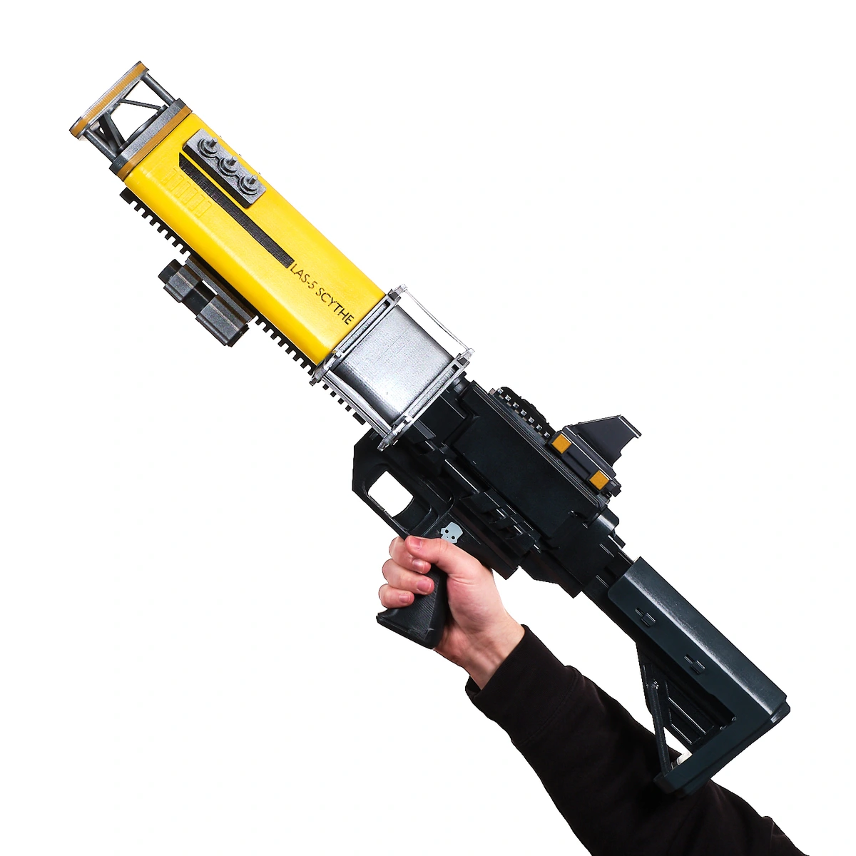 The prop features a sleek black body with bright yellow casing, red power cables, and a built-in scope. It’s packed with game-accurate sci-fi details like venting coils, heat shielding, and the “LAS-5 SCYTHE” mark etched on the barrel. The grip, body, and sight mirror the in-game design for a faithful look fans will recognize right away.