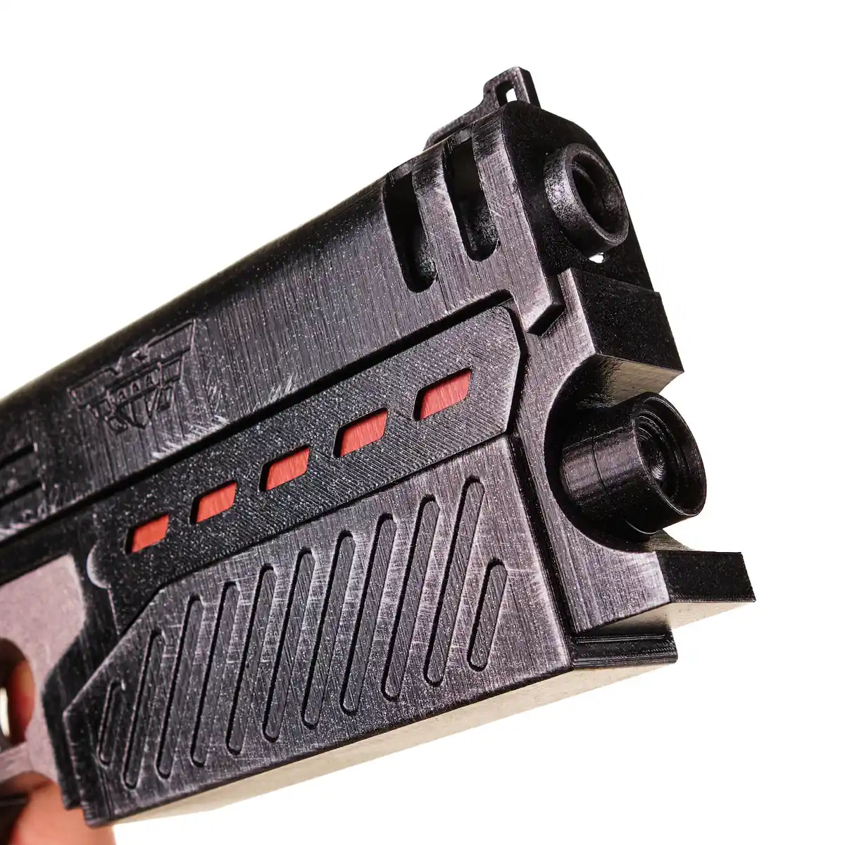 This replica features the signature blocky build of the original Lawgiver, complete with vented barrel detail, raised ridges, and stylized Mega-City One insignias on both sides. The red accent panels, two-tone coloring, and battle-worn paint give it a screen-used look straight from the movie’s war-torn streets.