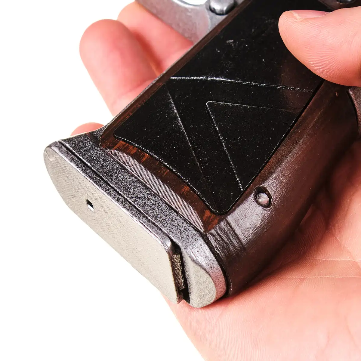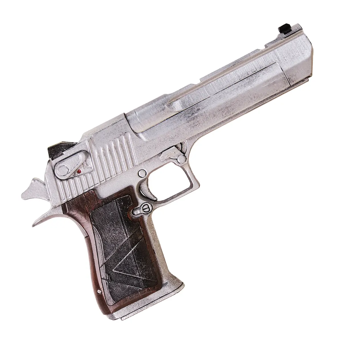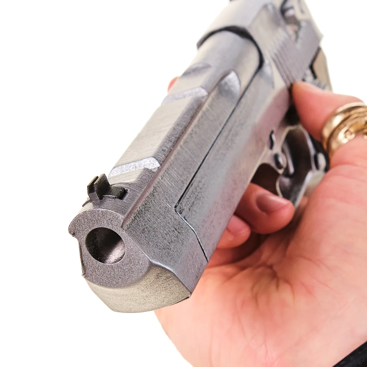 This is a static prop made of plastic. The trigger, hammer, and slide do not move. This is a non-functional cosplay and display piece, not a working firearm.