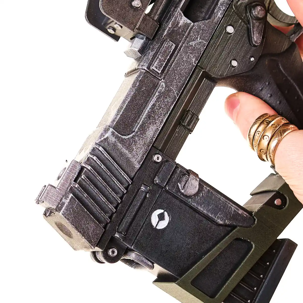 This full-size replica features the M66-SD’s signature design – tactical green and black finish, built-in suppressor, compact grip, and futuristic sight. From the barrel to the magwell, every part is shaped to match the look of the in-game weapon down to the sci-fi textures and techy angles.