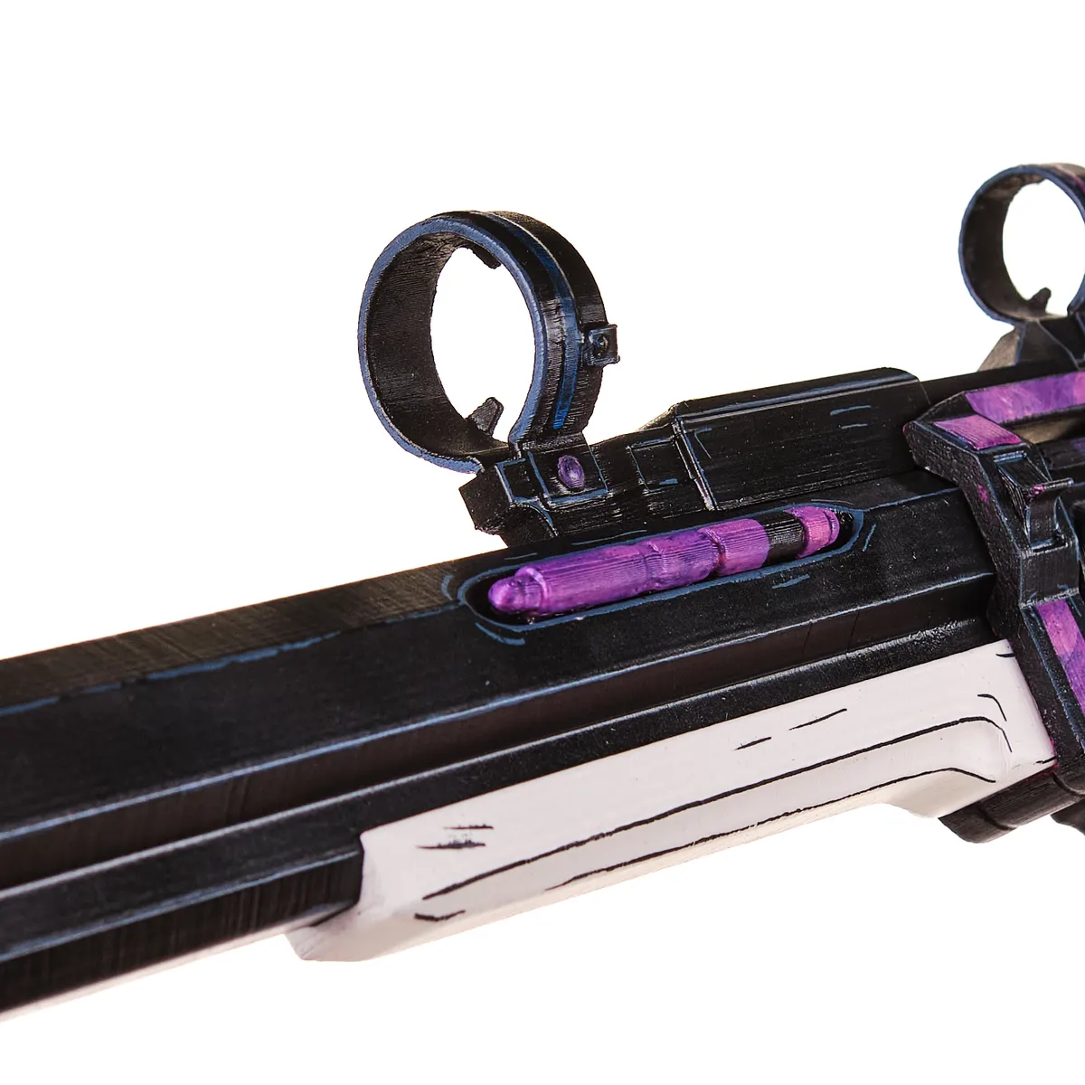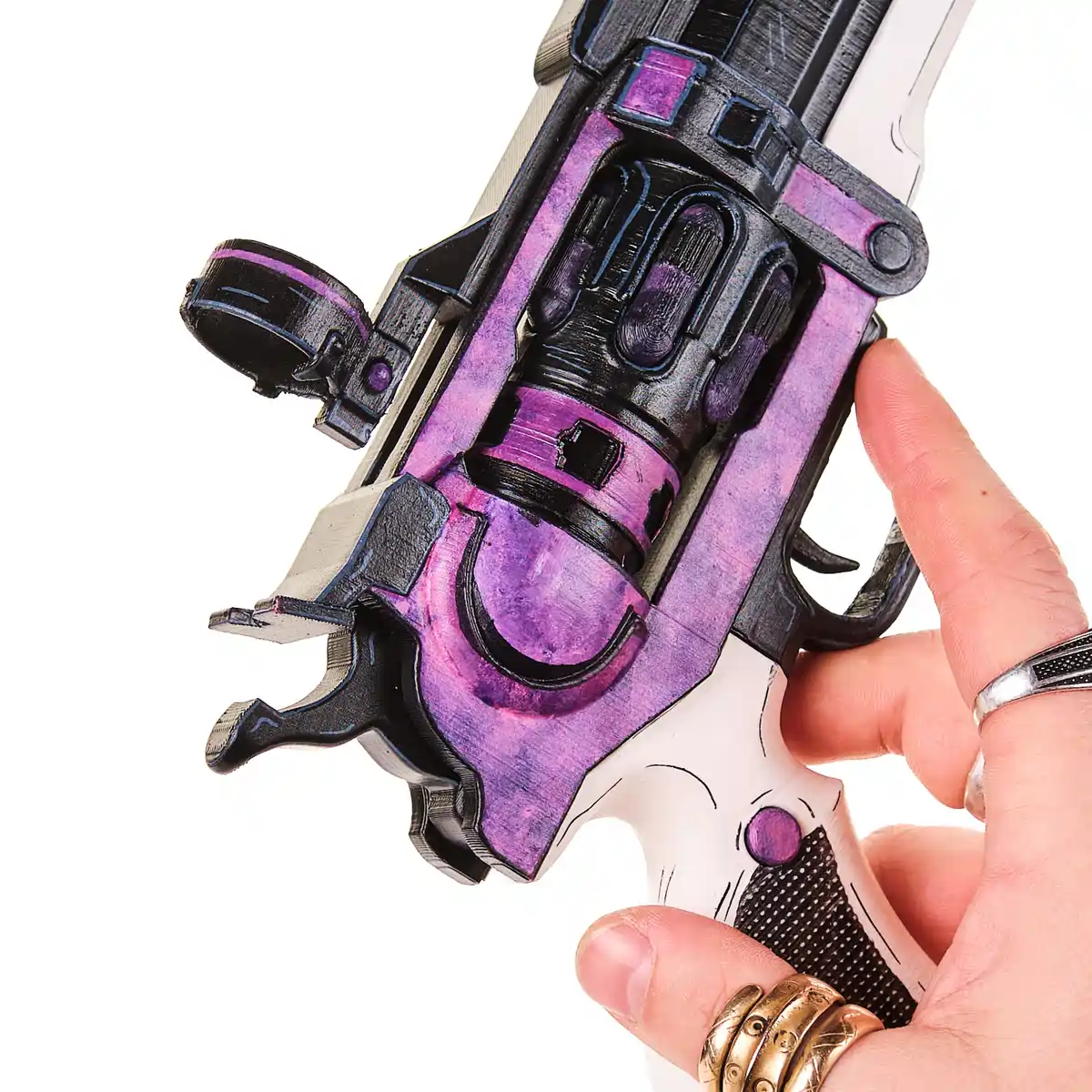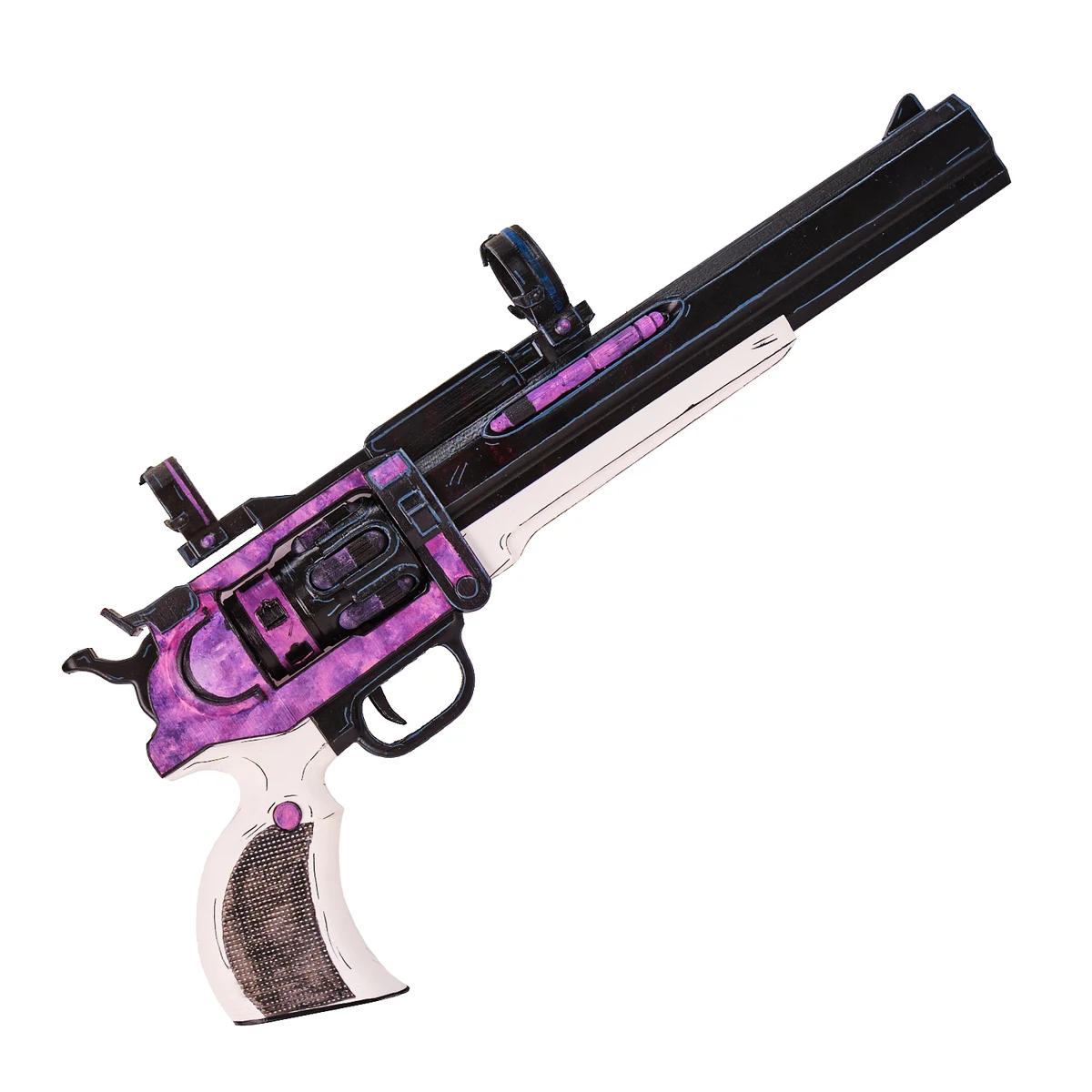 This prop replica features the iconic chunky revolver shape with a long barrel and thick frame. The bold purple and black finish gives it that rare, high-tier look from the game. The white grip with textured detail adds contrast and makes the design pop. Stylized lines and comic-style edging match the signature Borderlands art style perfectly.