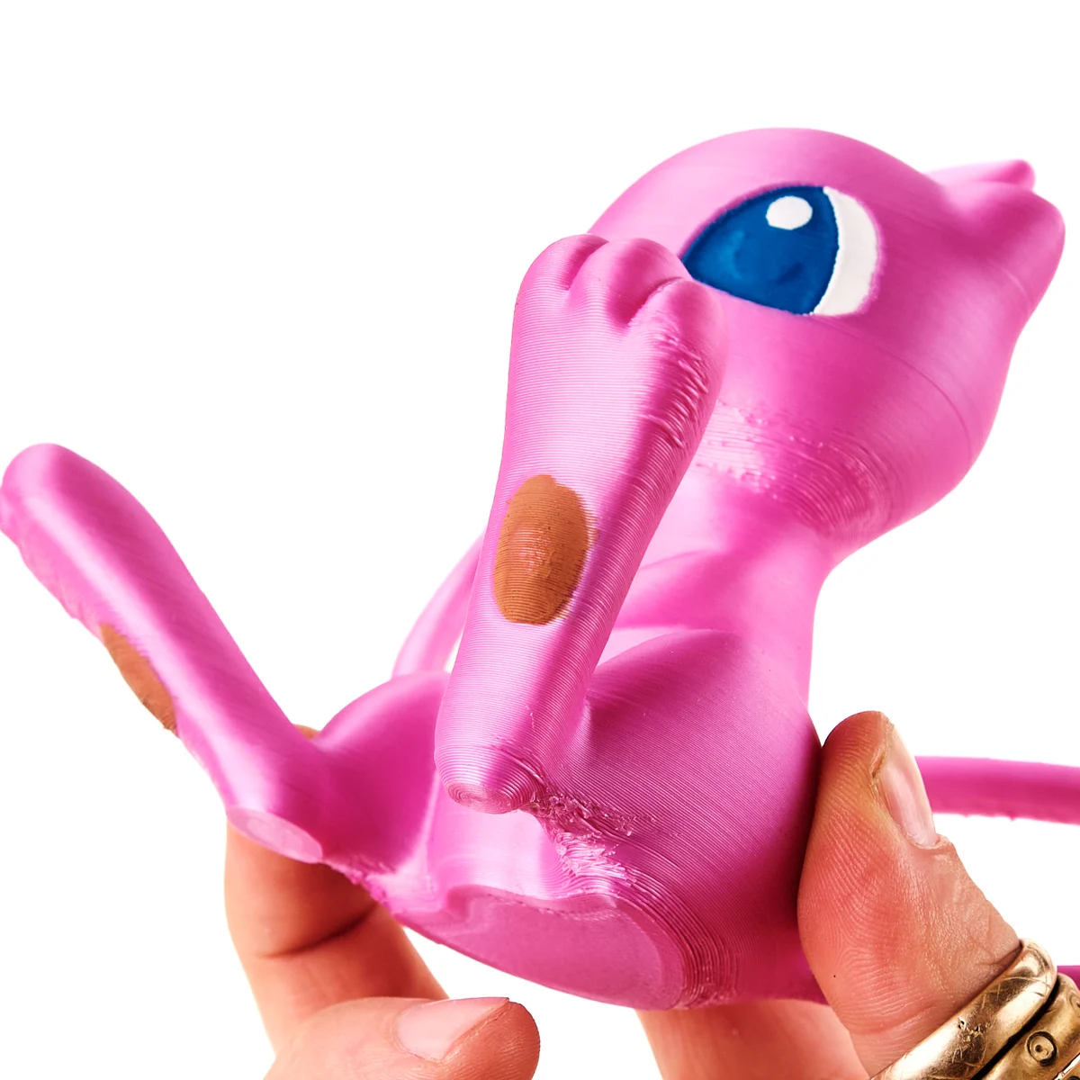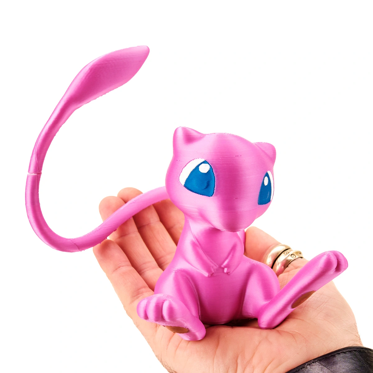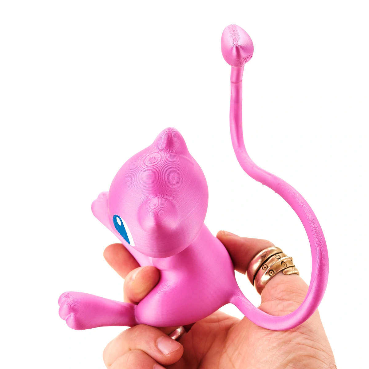 Mew is 3D printed in full color, so the pink body, big blue eyes, and long tail all come out bright and clean — no painting needed.