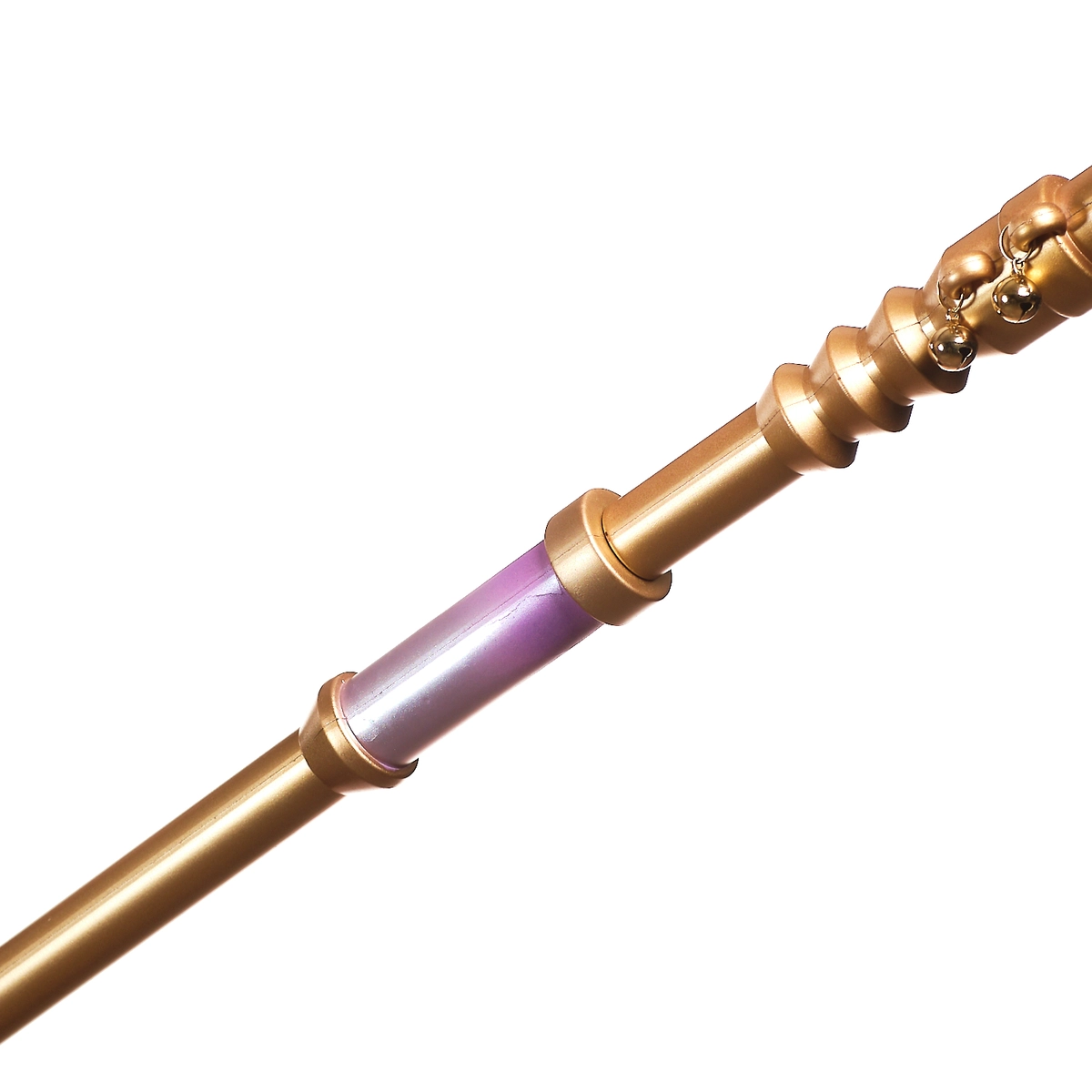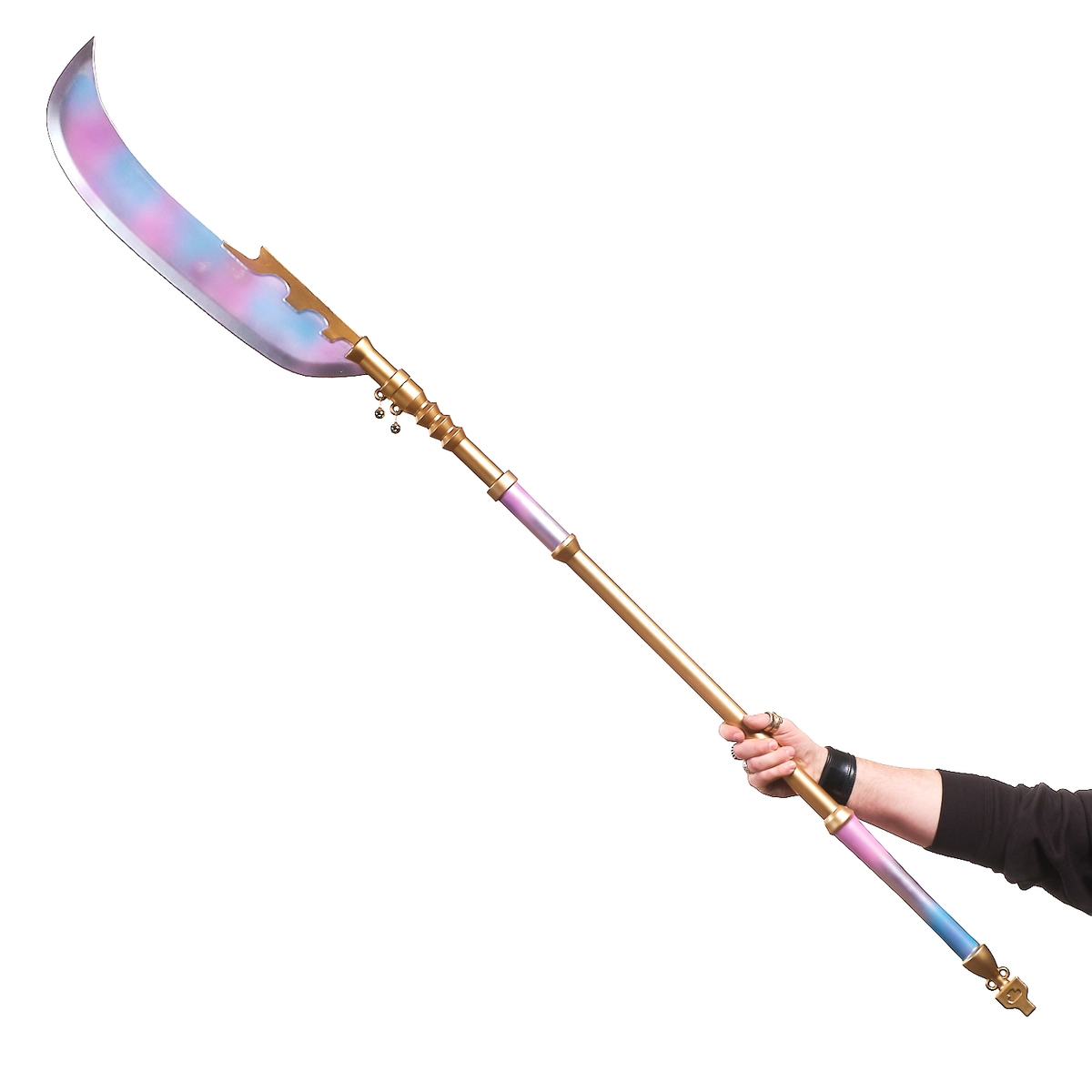 The shaft is finished in rich gold tones, accented with decorative rings and sculpted sections that add depth and detail. Small ornamental bells hang near the blade mount, adding a subtle decorative element that enhances the weapon’s mystical and performance-inspired aesthetic.