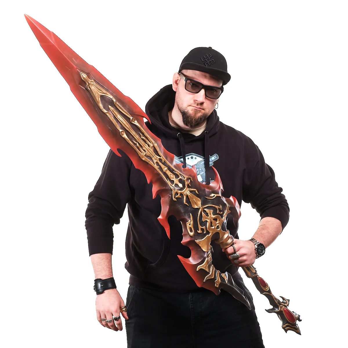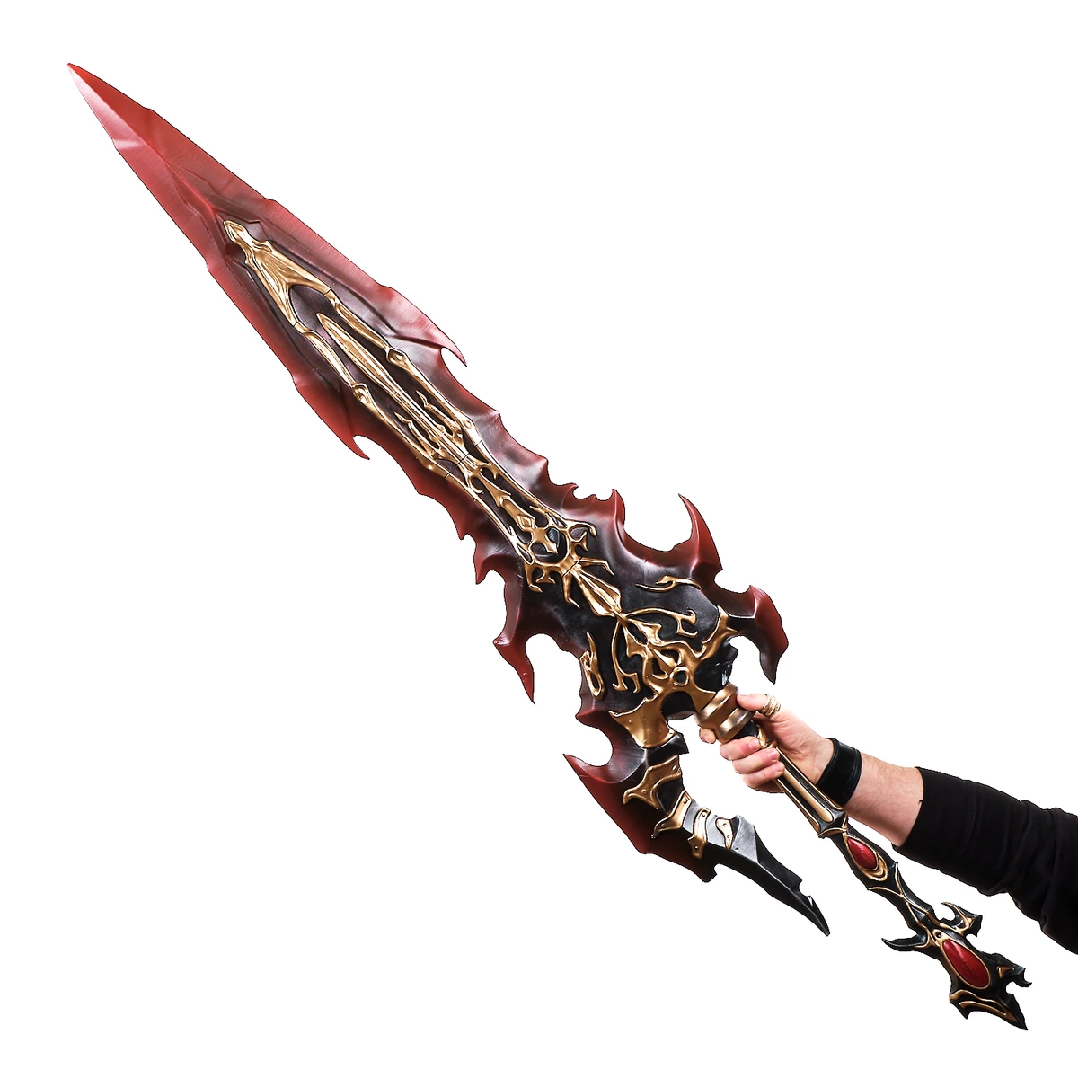 This prop replica features a large, heavy-looking blade with sharp, uneven edges and a deep red gradient finish. Gold patterns run across the center, giving it a mystical and ancient look. The handle is detailed with red gem-like accents and curved shapes that add to its fantasy design. The wide blade and bold shape make it an eye-catching piece from every angle.