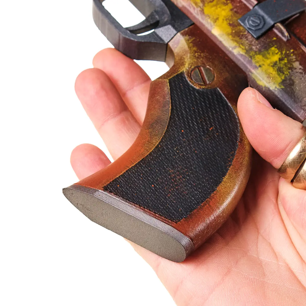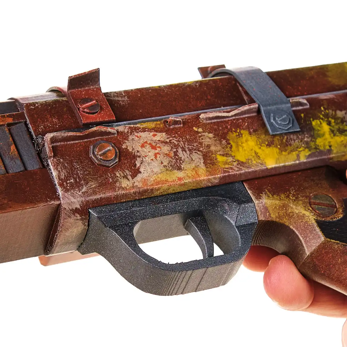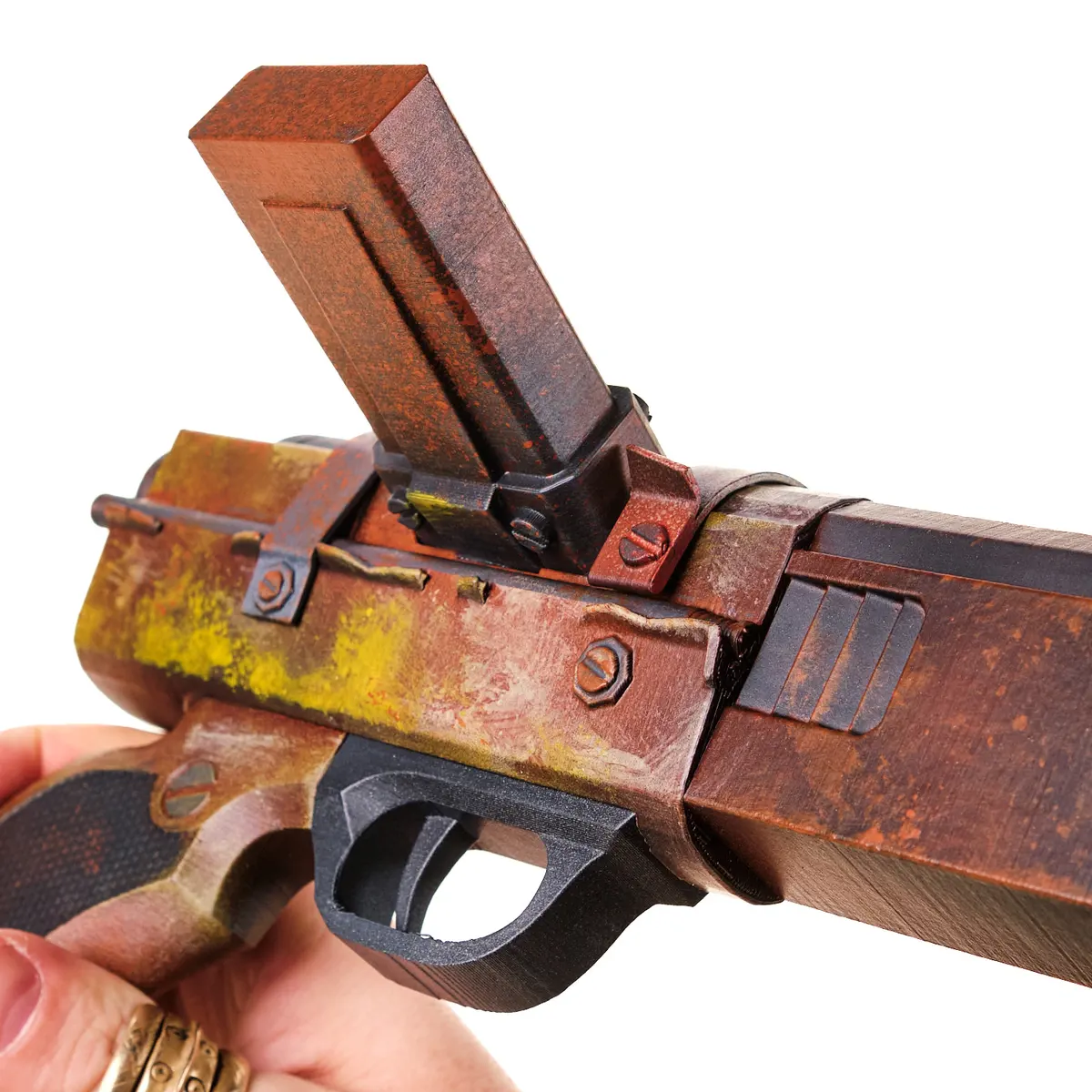 The prop is made from plastic with a solid but lightweight feel. The trigger and all other parts are static, making it safe for cosplay, display, and fan events. The rusted look and yellow paint splashes are handpainted, giving every piece its own unique, battle-worn charm.