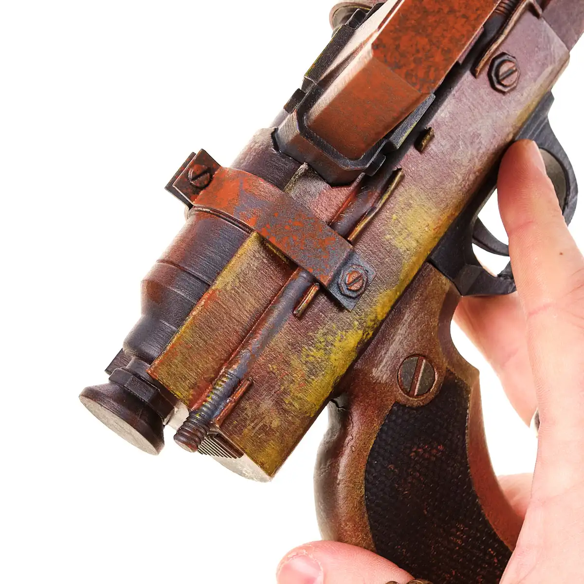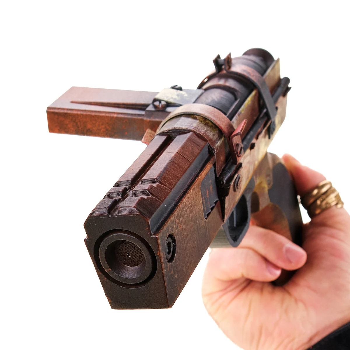 This handcrafted replica features the patched-together look of a real Bandit build: layered panels, oversized bolts, painted-on grime, and slapped-together metal straps. From its chunky muzzle to the spray-stained finish, it’s the kind of sidearm that looks like it’s been through a dozen shootouts and still fires (probably).