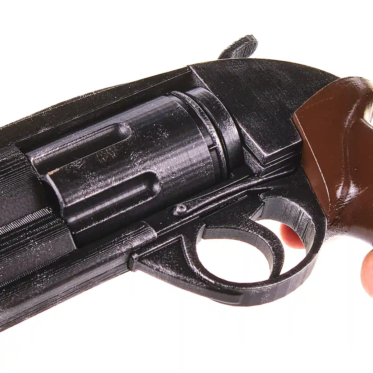 This prop replica features an oversized revolver design with a long, heavy barrel and a thick cylinder. The body has a worn, dark metal look with subtle weathering that adds to its gritty style. The grip is shaped in a smooth brown finish, giving it a classic feel that contrasts with the industrial upper frame. Vents along the barrel and detailed lines give it a bold and powerful silhouette.