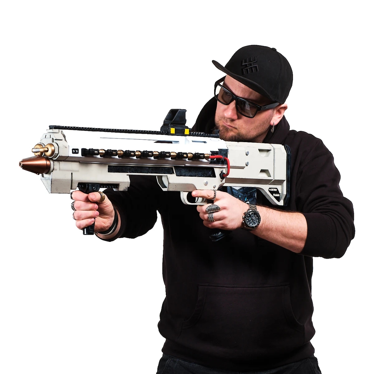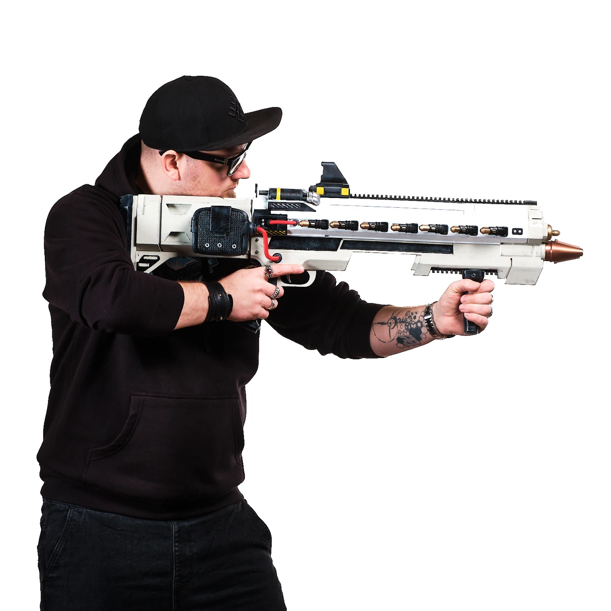 - Detailed sci-fi design with mounted sight and exposed wires