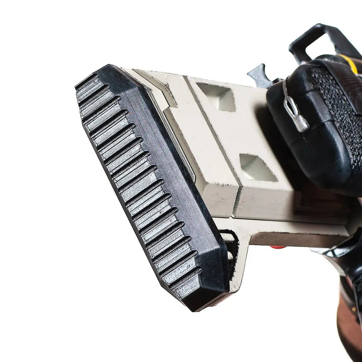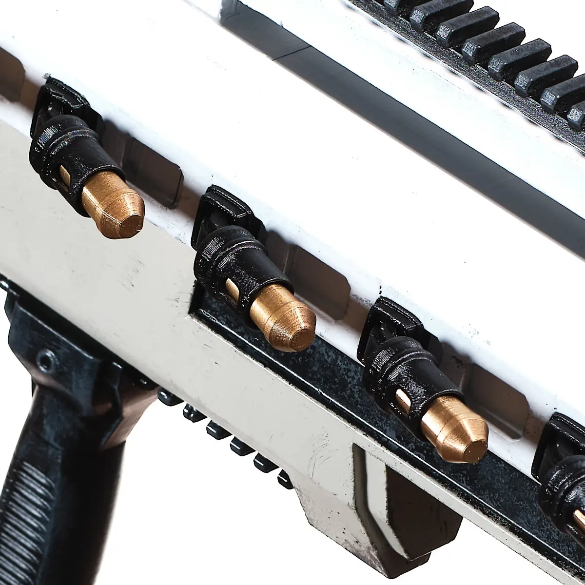 This prop replica features a large, solid body with a mix of smooth panels and detailed mechanical parts. The top rail, mounted sight, and exposed wires give it a strong sci-fi look. The front end has a bold muzzle design, while the side shows off detailed shells and components that add to its unique style. The grip and overall shape make it feel balanced and ready for display or cosplay.