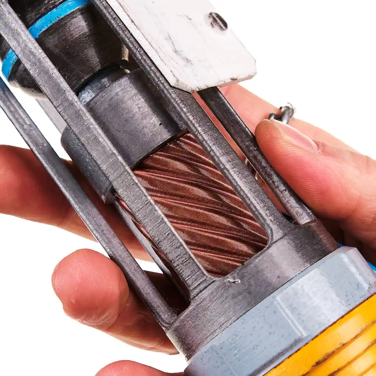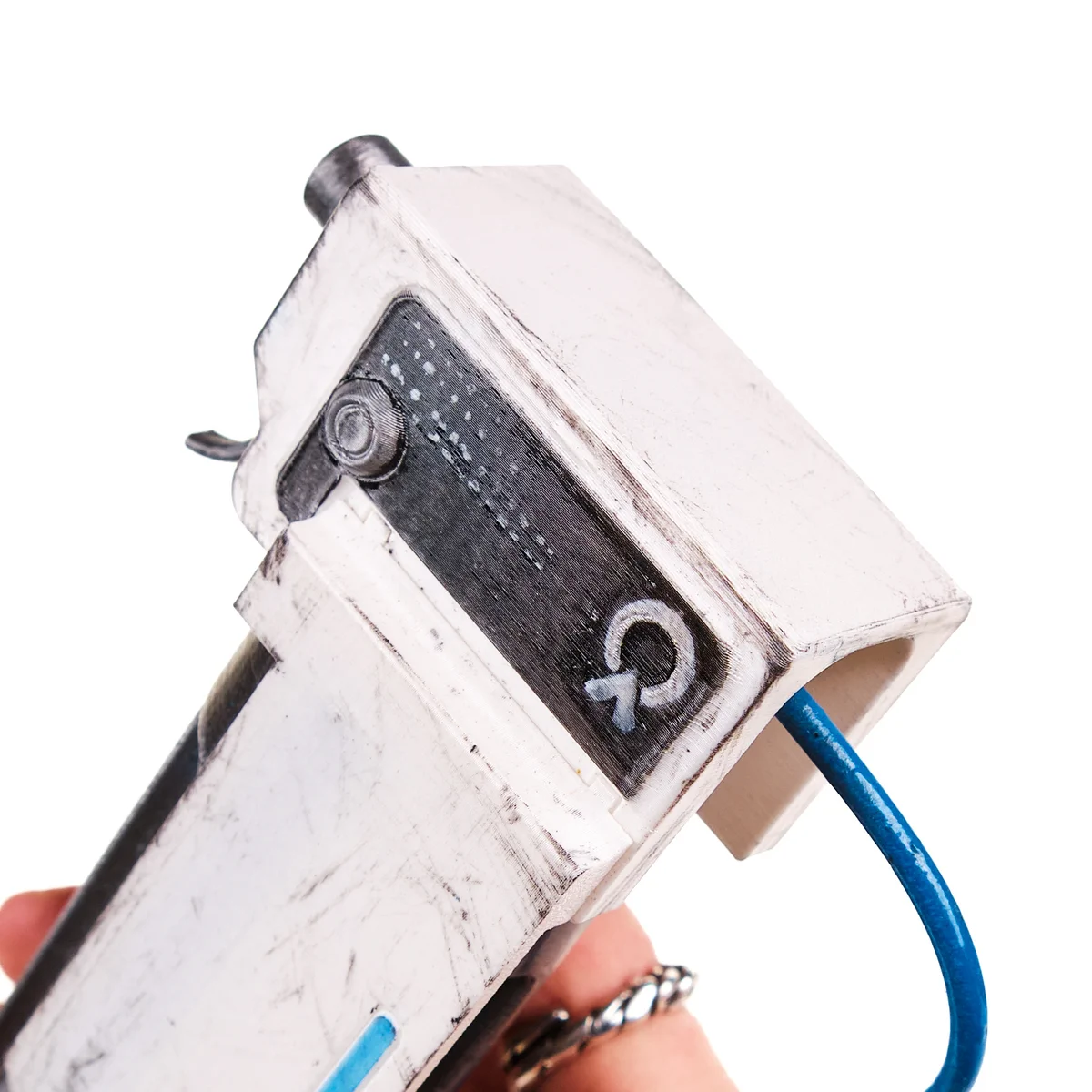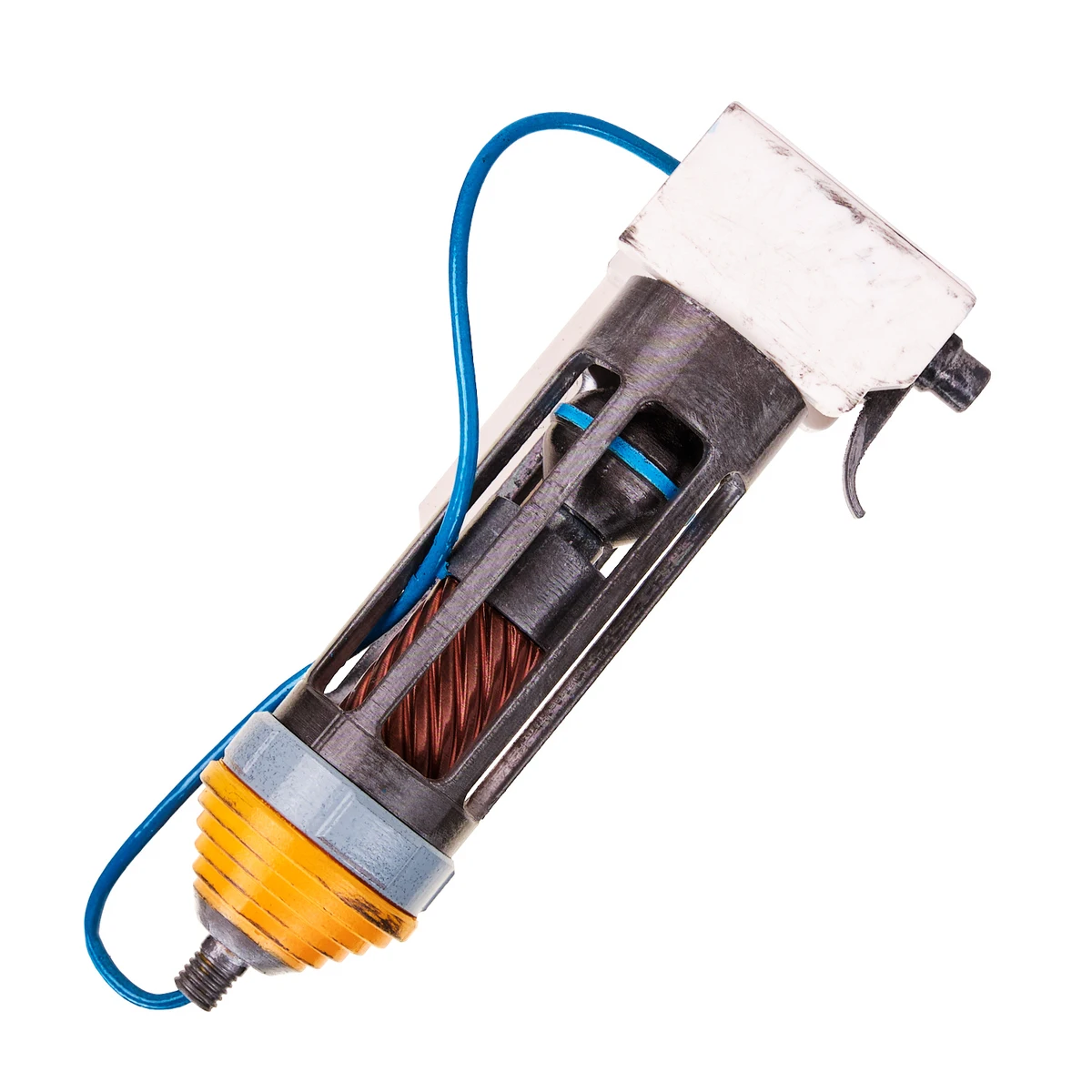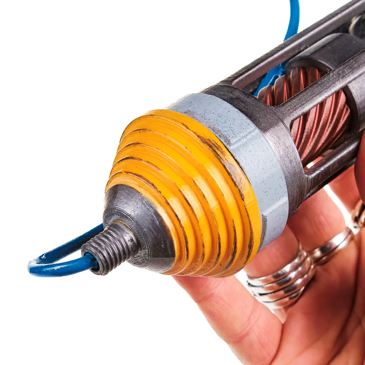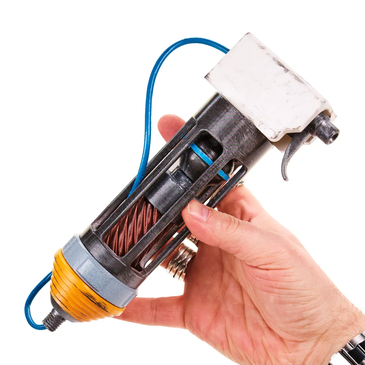 This prop features a slim, handheld design with a bright yellow coil tip, copper core wiring, and detailed blue cables wrapping around the body. The white casing on the top has game-accurate markings, making it feel like it came straight from the battlefield.