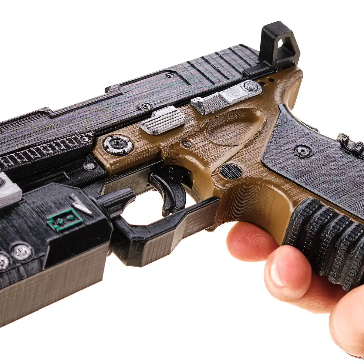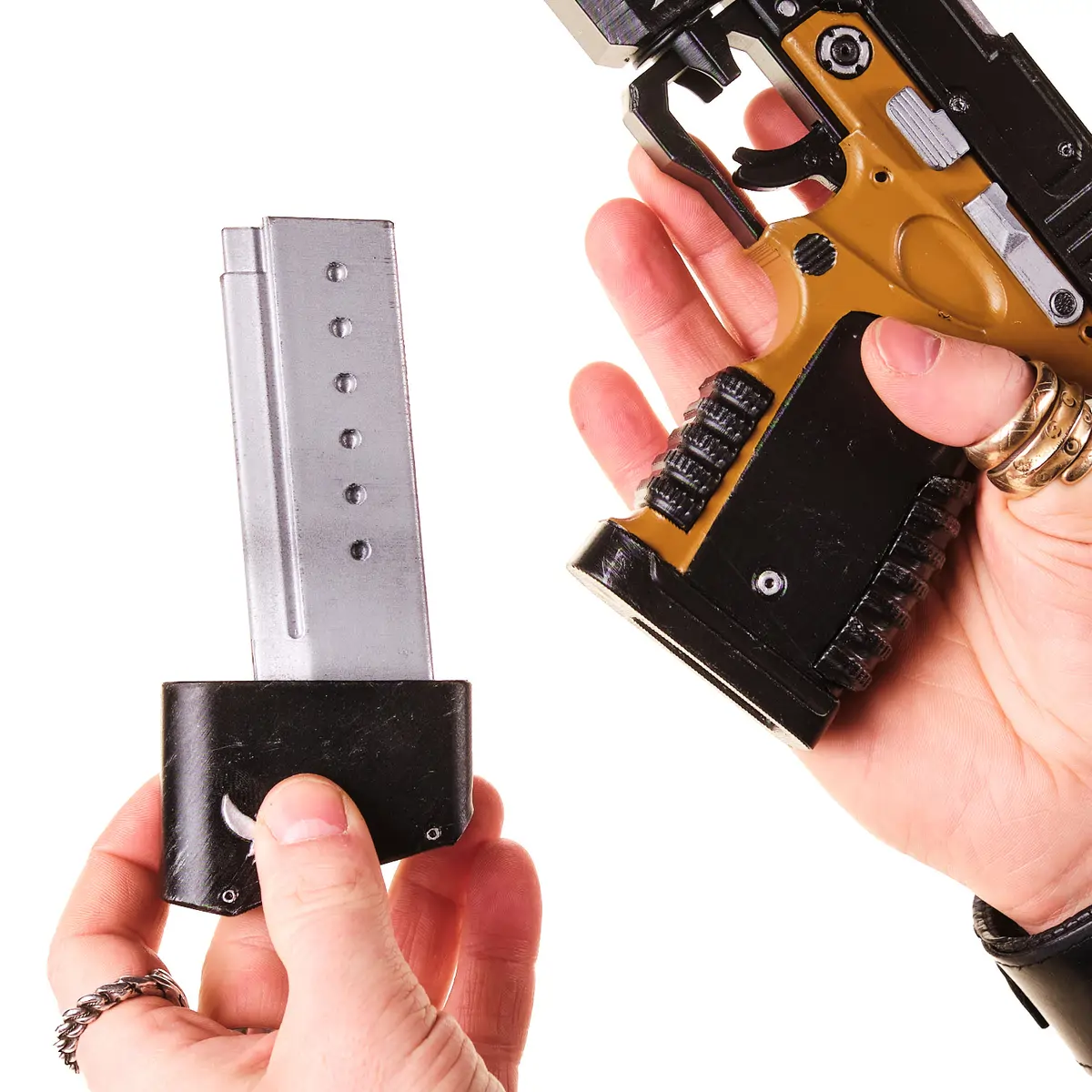 Each prop is handcrafted and handpainted by our artists. Since every piece is made by hand, paint details may be slightly different, but all are made to match the Smart Pistol MK6 from the game as closely as possible.