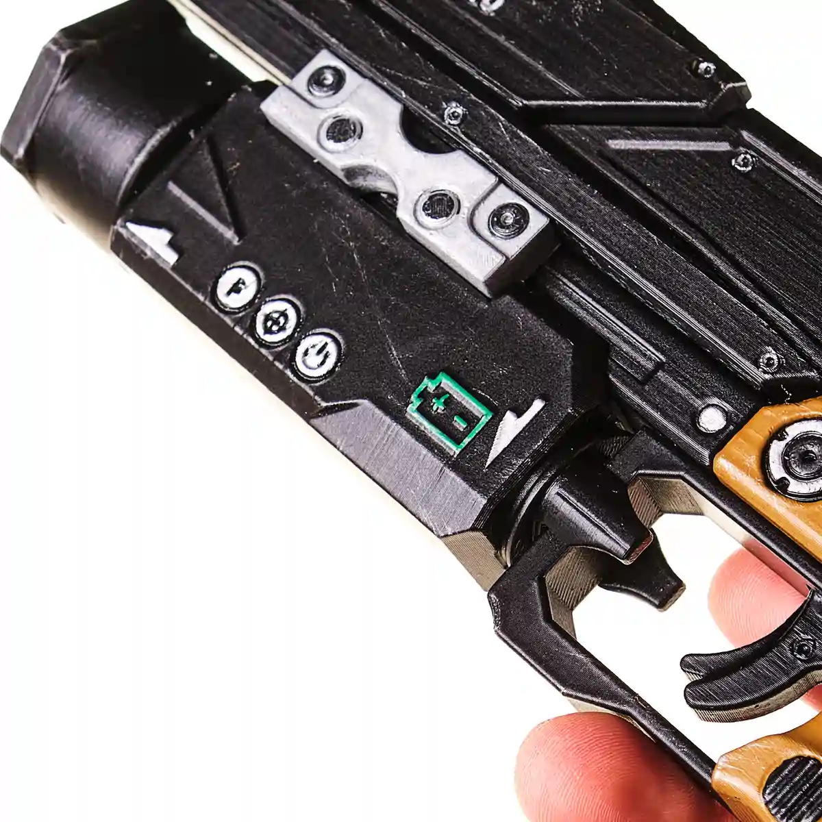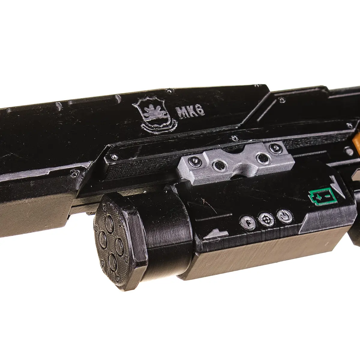 This replica features a futuristic sci-fi look, with a sleek black and tan frame, molded grip, and built-in targeting module. Details like the MK6 crest, charging port symbols, and raised screws help bring the prop to life just like in-game.