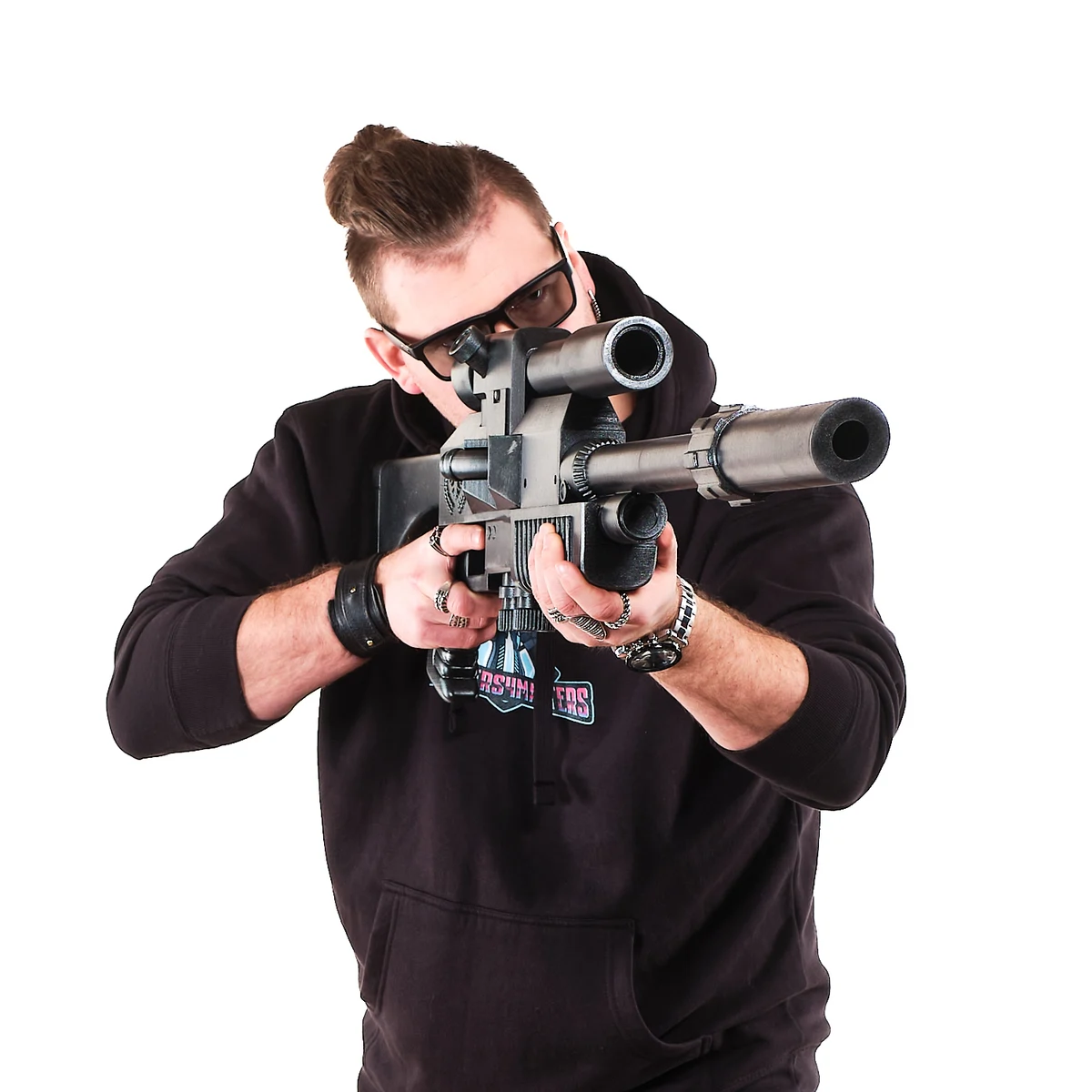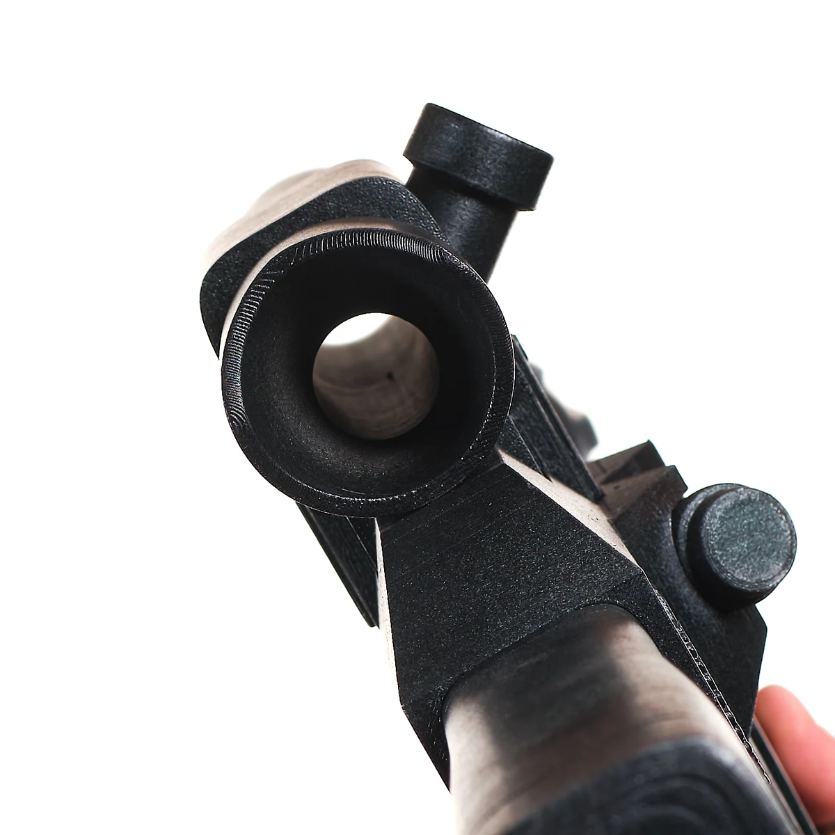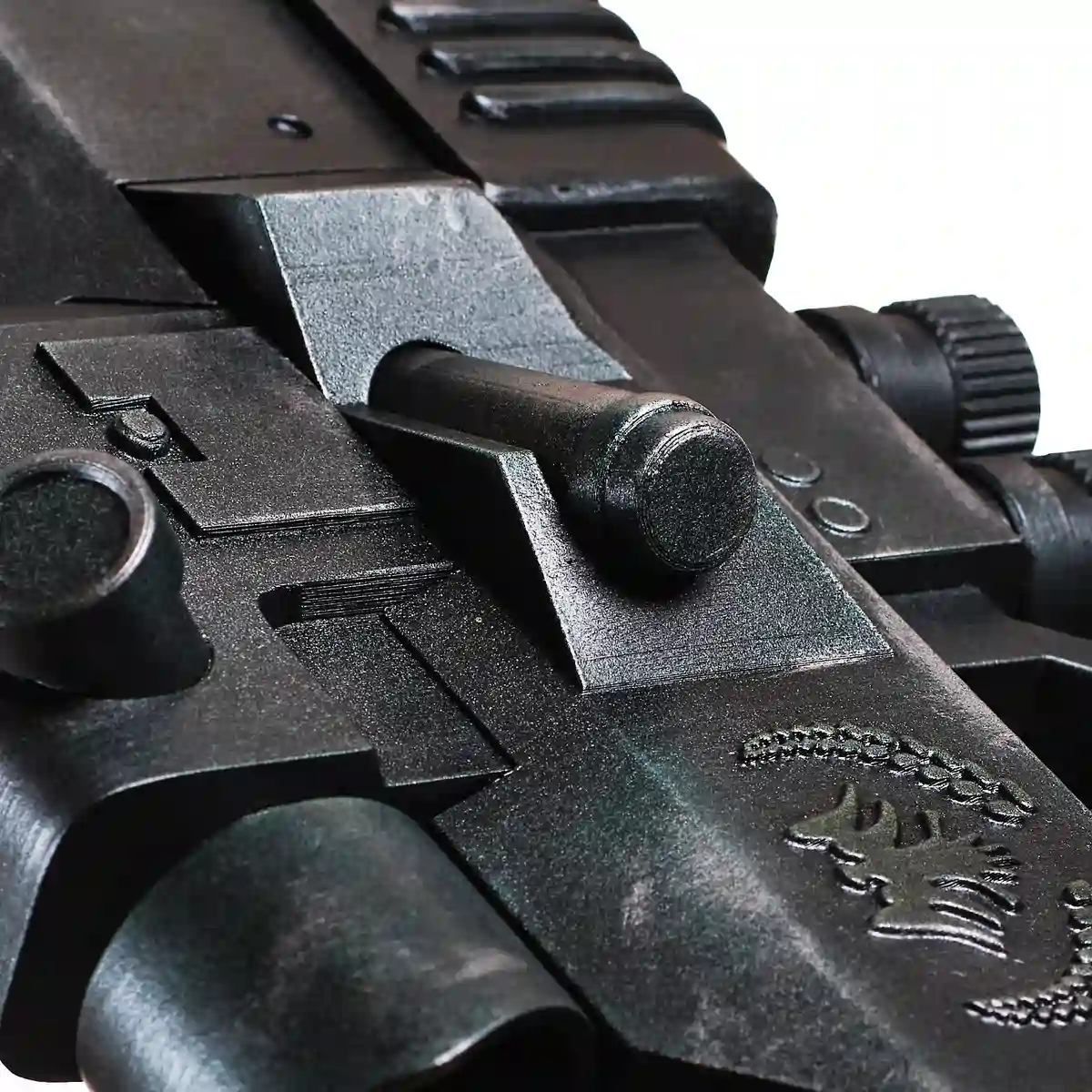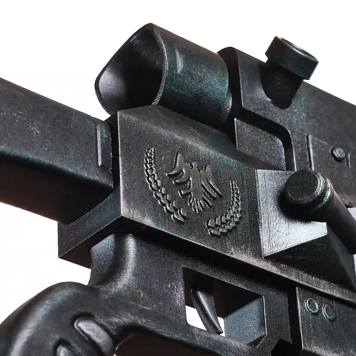 The rifle features a long barrel, textured handgrip, bold receiver with detailed emblem work, and twin dial-like elements near the front for added visual depth. It’s shaped for presence and built to stand out in any collection or cosplay setup.