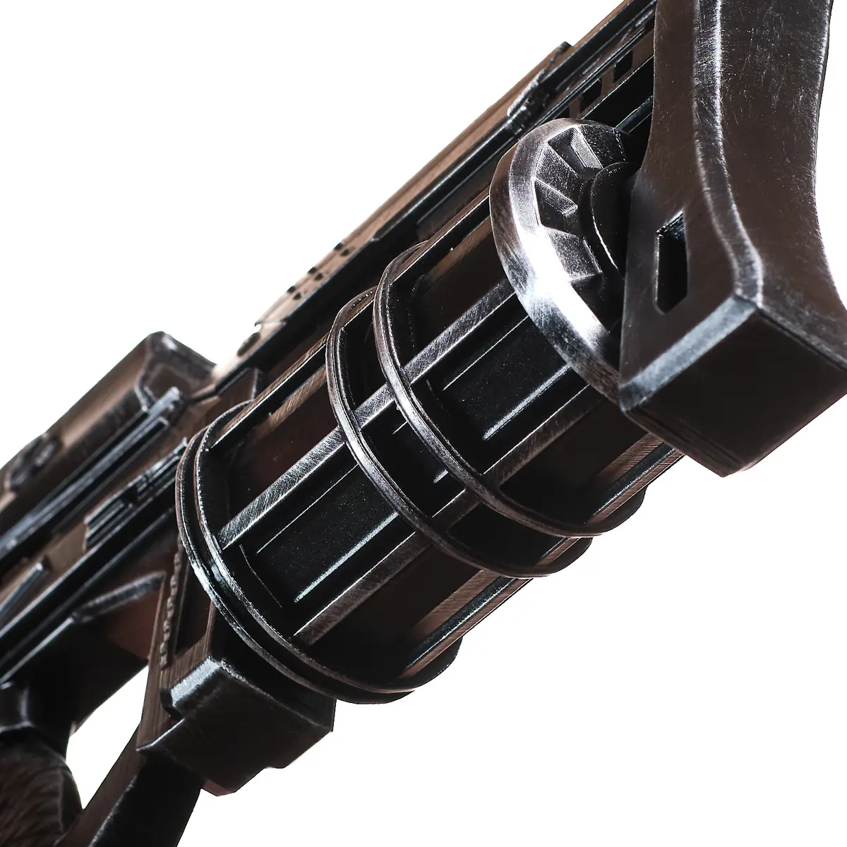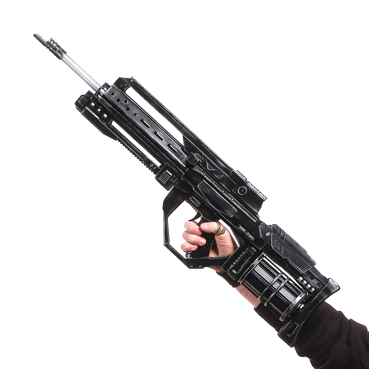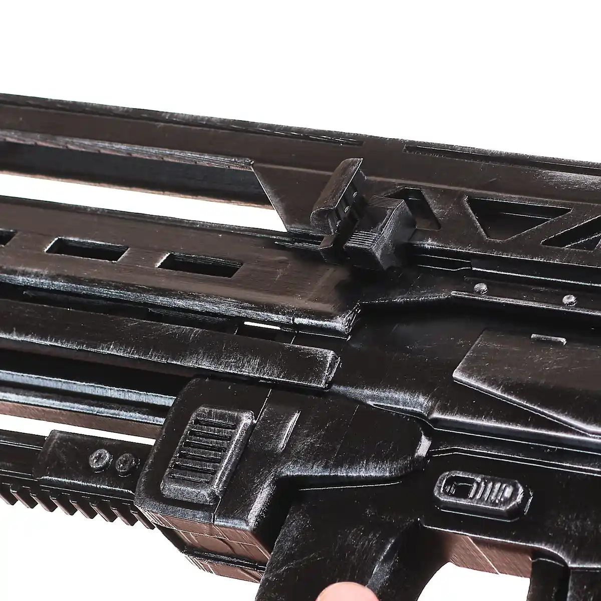This handcrafted prop replica features the long, squared barrel, vented upper frame, and thick, tactical body that define the StA409 Keyzer. From the blocky muzzle to the reinforced grip and angular guard, every detail reflects the rugged military style of the game. The dark finish and sharp edges give it that cold, futuristic combat look straight from the front lines.