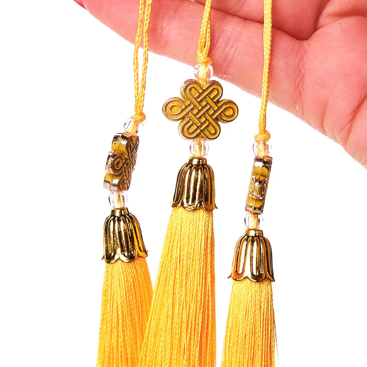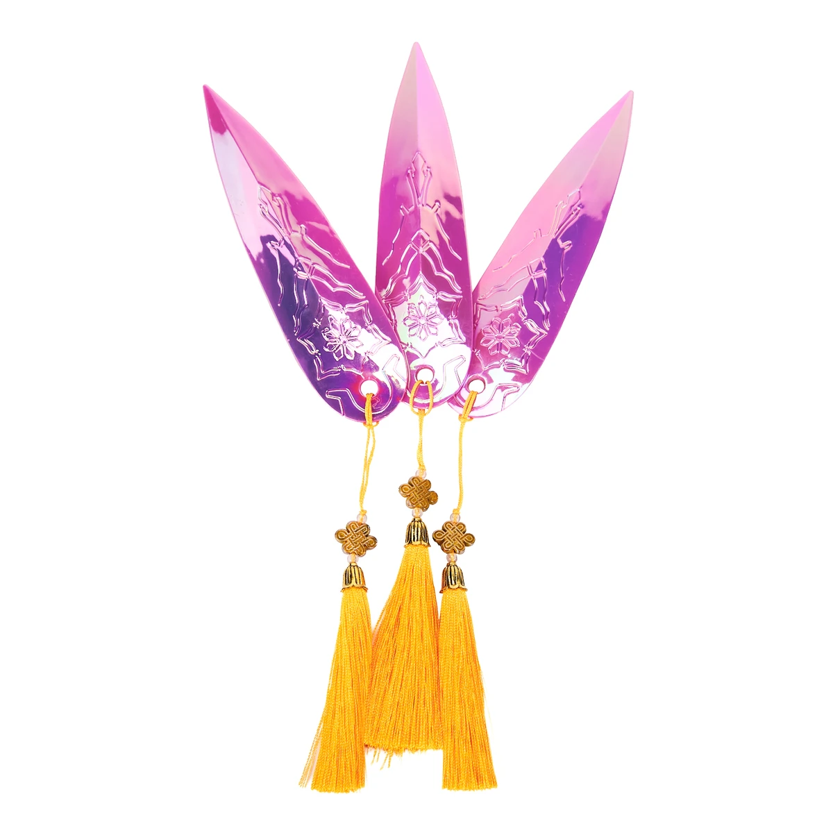 At the base of the dart, a vibrant yellow tassel with decorative golden beads adds a beautiful contrast to the sleek blade. The tassel and knot details give the prop a ceremonial feel, blending traditional ornamentation with modern fantasy weapon design.