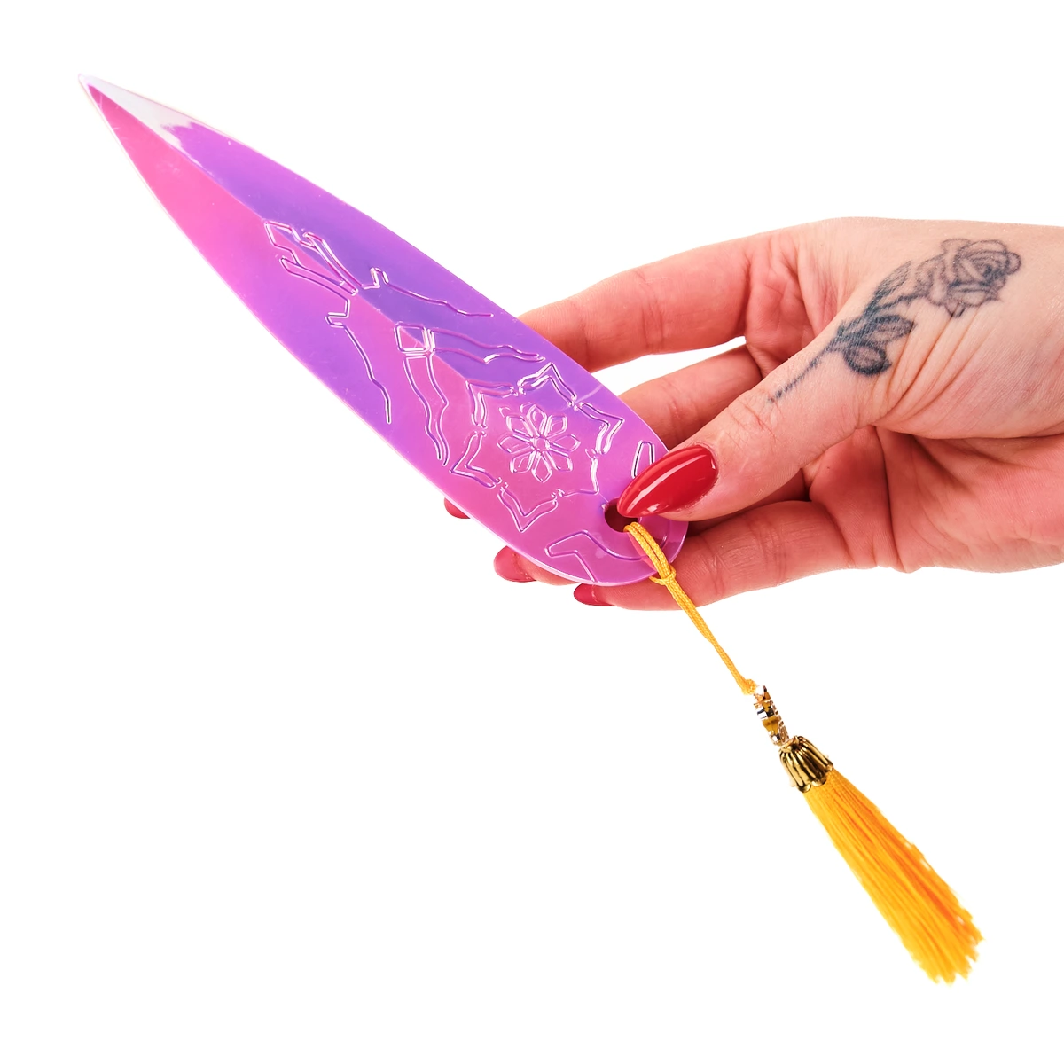 The Zoey Dart features a slim, blade-shaped silhouette with a glossy pink-to-purple gradient finish that instantly stands out. The surface is decorated with engraved patterns inspired by the weapon seen in the series, giving the piece a refined, high-tech aesthetic while still feeling magical and ornamental.